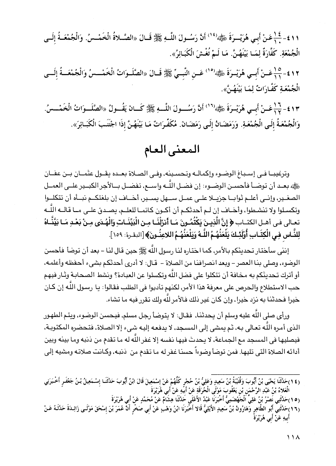 411 - عن أبي هريرة رضي الله عنه أن رسول الله صلى الله عليه وسلم قال "الصلاة الخمس. والجمعة إلى الجمعة. كفارة لما بينهن. ما لم تغش الكبائر".
