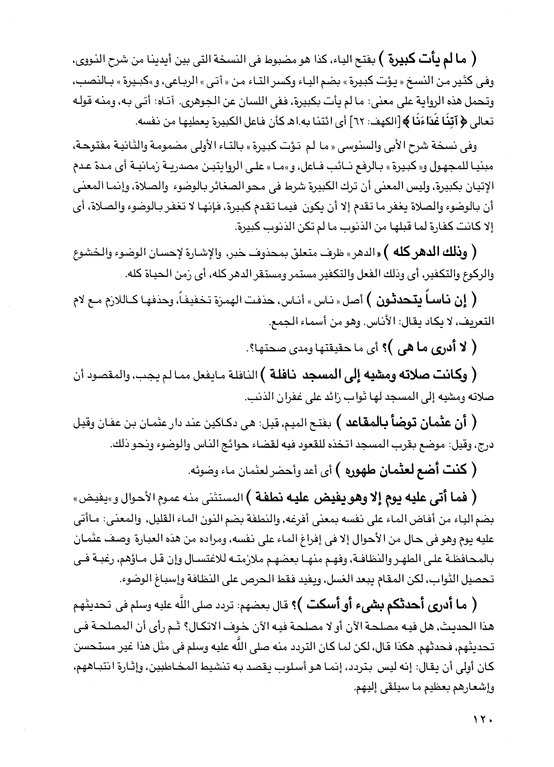 وفي نسخة شرح الأبي والسنوسي "ما لم تؤت كبيرة" بالتاء الأولى مضمومة والثانية مفتوحة، مبنيا للمجهول و"كبيرة" بالرفع نائب فاعل، و"ما" على الروايتين مصدرية زمانية أي مدة عدم الإتيان بكبيرة، وليس المعنى أن ترك الكبيرة شرط في محو الصغائر بالوضوء والصلاة، وإنما المعنى أن بالوضوء والصلاة يغفر ما تقدم إلا أن يكون فيما تقدم كبيرة، فإنها لا تغفر بالوضوء والصلاة، أي إلا كانت كفارة لما قبلها من الذنوب ما لم تكن الذنوب كبيرة.