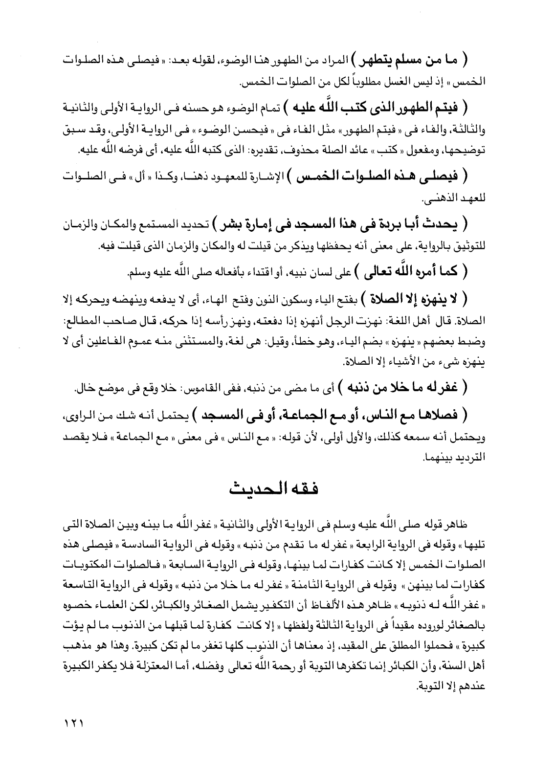 ظاهر قوله صلى الله عليه وسلم في الرواية الأولى والثانية "غفر الله ما بينه وبين الصلاة التي تليها" وقوله في الرواية الرابعة "غفر له ما تقدم من ذنبه" وقوله في الرواية السادسة" فيصلي هذه الصلوات الخمس إلا كانت كفارات لما بينها، وقوله في الرواية السابعة "فالصلوات المكتوبات كفارات لما بينهن" وقوله في الرواية الثامنة "غفر له ما خلا من ذنبه" وقوله في الرواية التاسعة "غفر الله له ذنوبه" ظاهر هذه الألفاظ أن التكفير يشمل الصغائر والكبائر، لكن العلماء خصوه بالصغائر لوروده مقيدا في الرواية الثالثة ولفظها "إلا كانت كفارة لما قبلها من الذنوب ما لم يؤت كبيرة" فحملوا المطلق على المقيد، إذ معناها أن الذنوب كلها تغفر ما لم تكن كبيرة. وهذا هو مذهب أهل السنة، وأن الكبائر إنما تكفرها التوبة أو رحمة الله تعالى وفضله، أما المعتزلة فلا يكفر الكبيرة عندهم إلا التوبة.