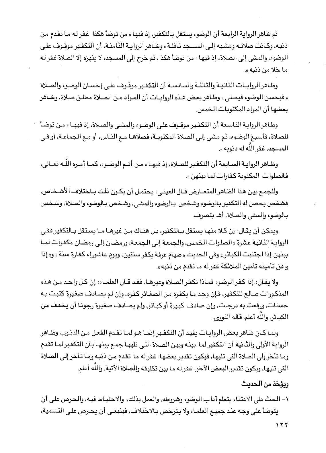 ثم ظاهر الرواية الرابعة أن الوضوء يستقل بالتكفير، إذ فيها "من توضأ هكذا غفر له ما تقدم من ذنبه، وكانت صلاته ومشيه إلى المسجد نافلة" وظاهر الرواية الثامنة، أن التكفير موقوف على الوضوء، والمشي إلى الصلاة، إذ فيها "من توضأ هكذا، ثم خرج إلى المسجد، لا ينهزه إلا الصلاة غفر له ما خلا من ذنبه".