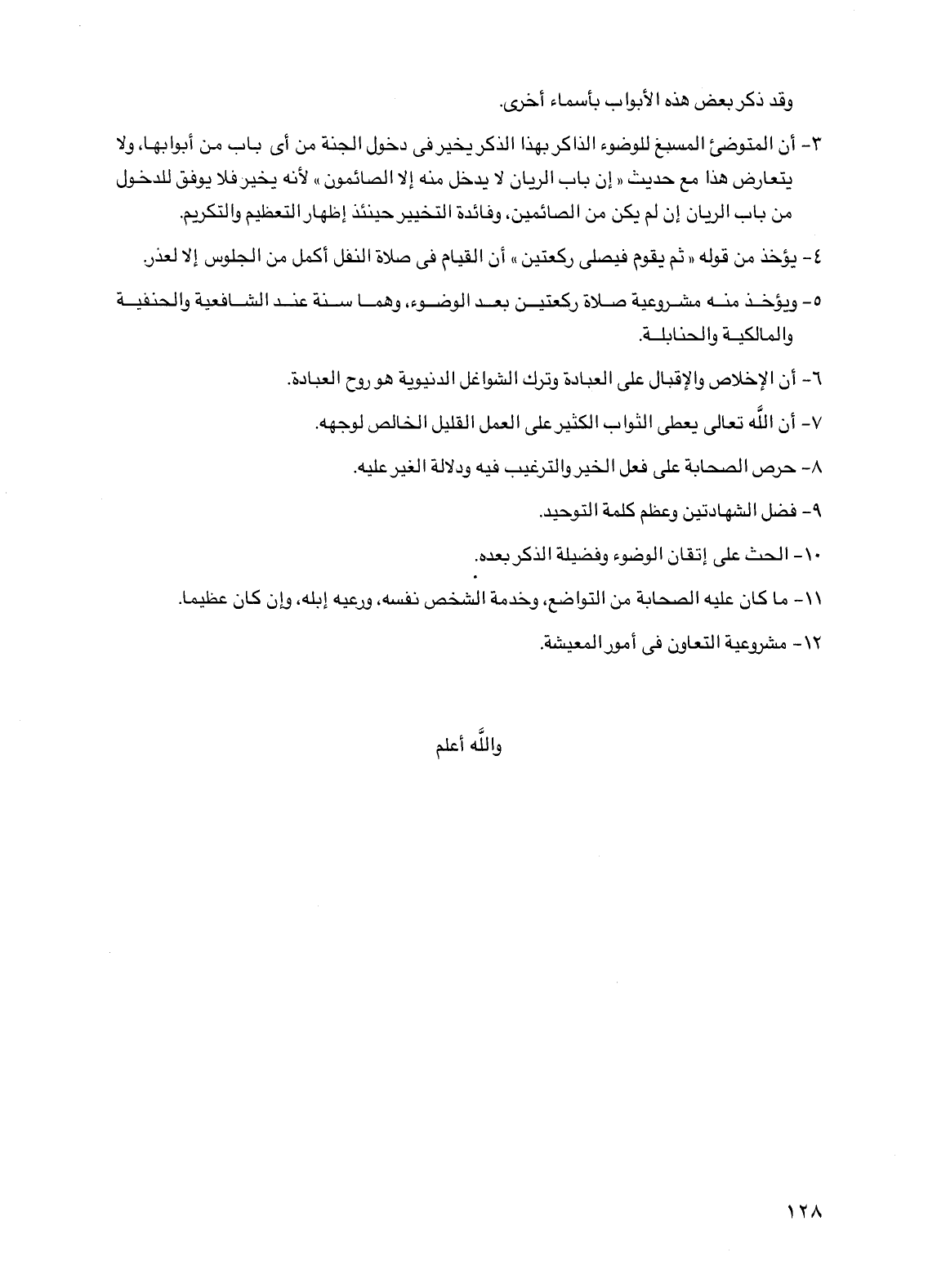 3 - أن المتوضئ المسبغ للوضوء الذاكر بهذا الذكر يخير في دخول الجنة من أي باب من أبوابها، ولا يتعارض هذا مع حديث "إن باب الريان لا يدخل منه إلا الصائمون" لأنه يخير فلا يوفق للدخول من باب الريان إن لم يكن من الصائمين، وفائدة التخيير حينئذ إظهار التعظيم والتكريم.