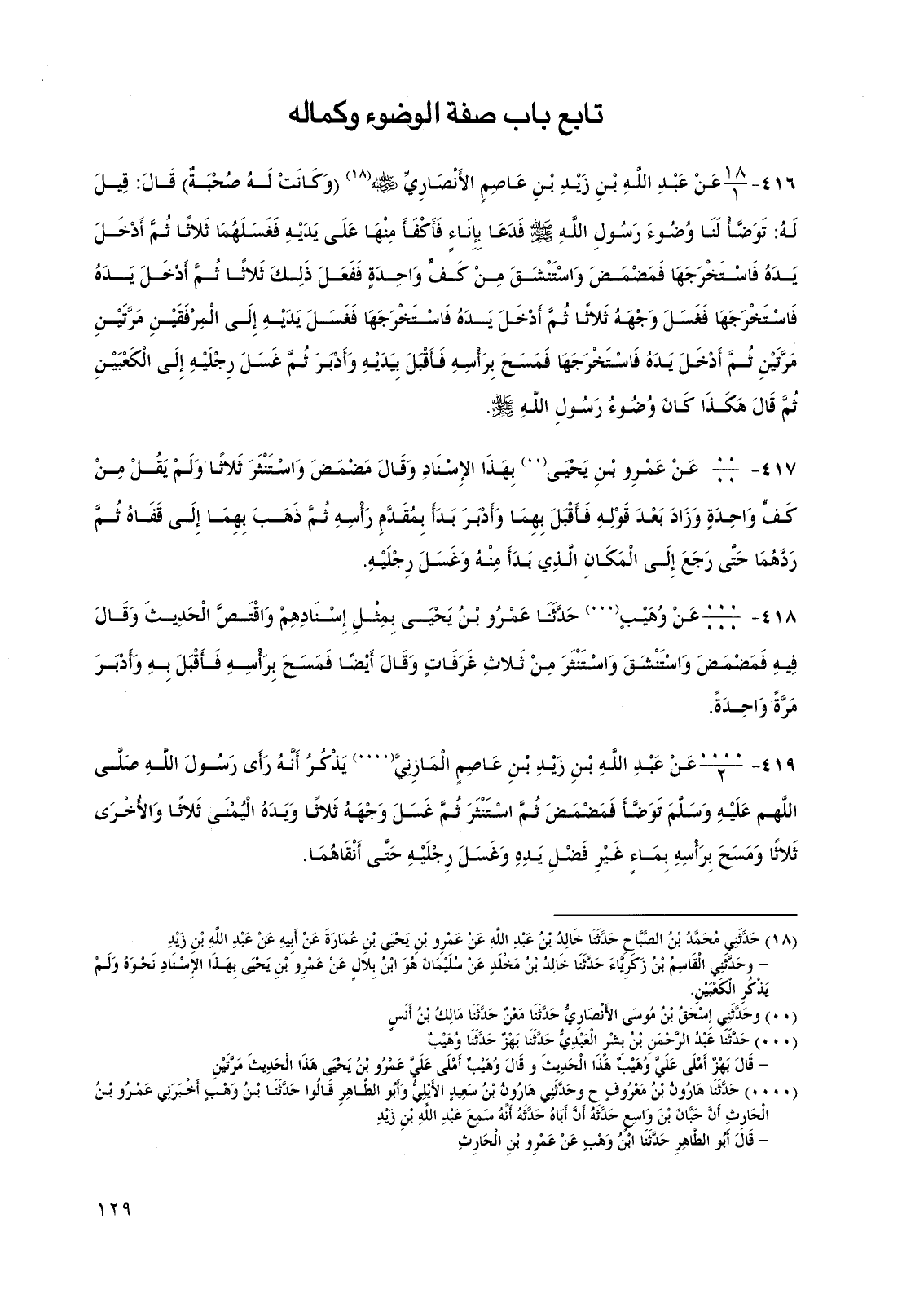 416 - عن عبد الله بن زيد بن عاصم الأنصاري رضي الله عنه (وكانت له صحبة) قال: قيل له: توضأ لنا وضوء رسول الله صلى الله عليه وسلم فدعا بإناء فأكفأ منها على يديه فغسلهما ثلاثا ثم أدخل يده فاستخرجها فمضمض واستنشق من كف واحدة ففعل ذلك ثلاثا ثم أدخل يده فاستخرجها فغسل وجهه ثلاثا ثم أدخل يده فاستخرجها فغسل يديه إلى المرفقين مرتين مرتين ثم أدخل يده فاستخرجها فمسح برأسه فأقبل بيديه وأدبر ثم غسل رجليه إلى الكعبين ثم قال هكذا كان وضوء رسول الله صلى الله عليه وسلم.