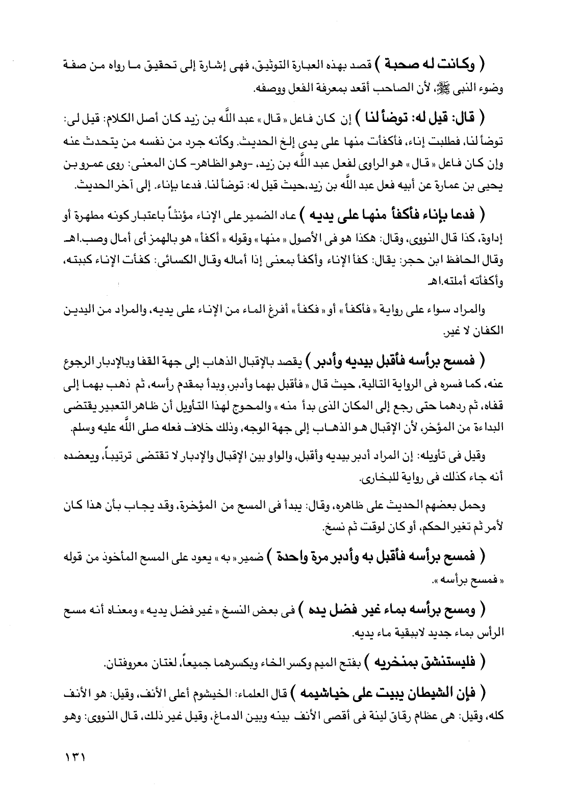 (فمسح برأسه فأقبل بيديه وأدبر) يقصد بالإقبال الذهاب إلى جهة القفا وبالإدبار الرجوع عنه، كما فسره في الرواية التالية، حيث قال "فأقبل بهما وأدبر، وبدأ بمقدم رأسه، ثم ذهب بهما إلى قفاه، ثم ردهما حتى رجع إلى المكان الذي بدأ منه" والمحوج لهذا التأويل أن ظاهر التعبير يقتضي البداءة من المؤخر، لأن الإقبال هو الذهاب إلى جهة الوجه، وذلك خلاف فعله صلى الله عليه وسلم.