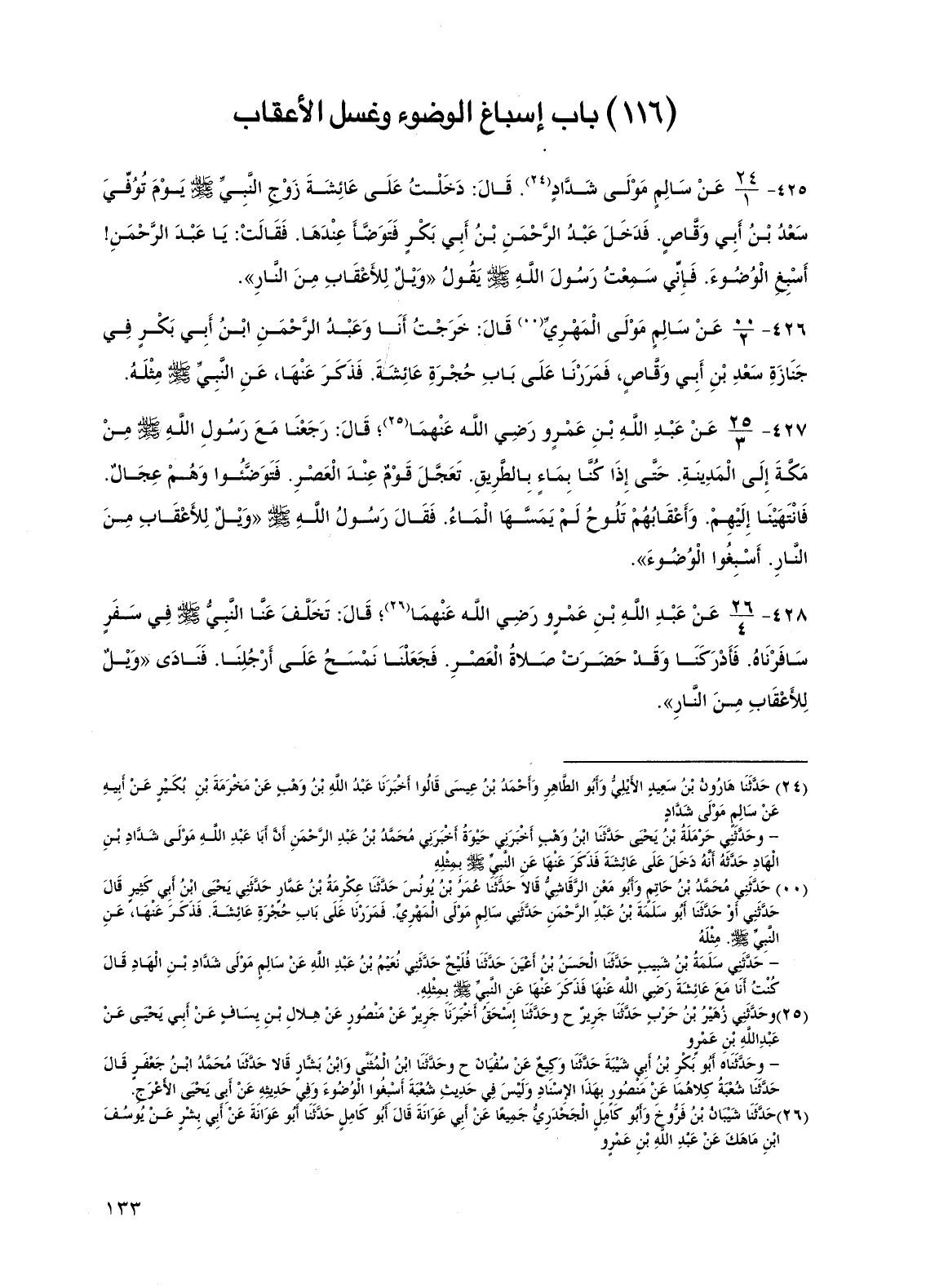 425 - عن سالم مولى شداد. قال: دخلت على عائشة زوج النبى صلى الله عليه وسلم يوم توفي سعد بن أبى وقاص. فدخل عبد الرحمن بن أبى بكر فتوضأ عندها. فقالت: يا عبد الرحمن! أسبغ الوضوء. فإني سمعت رسول الله صلى الله عليه وسلم يقول "ويل للأعقاب من النار".