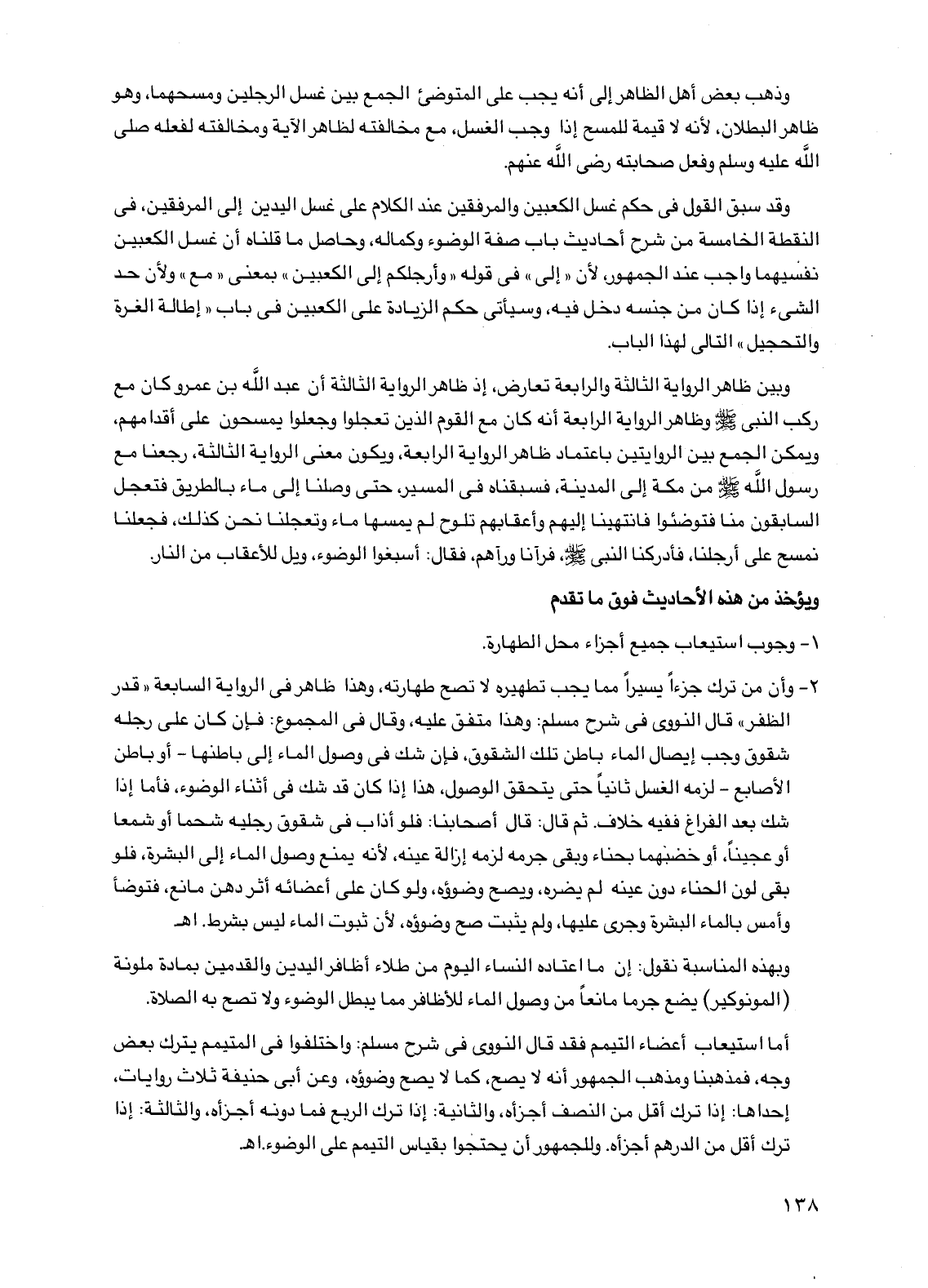 2 - وأن من ترك جزءا يسيرا مما يجب تطهيره لا تصح طهارته، وهذا ظاهر في الرواية السابعة "قدر الظفر" قال النووي في شرح مسلم: وهذا متفق عليه، وقال في المجموع: فإن كان على رجله شقوق وجب إيصال الماء باطن تلك الشقوق، فإن شك في وصول الماء إلى باطنها -أو باطن الأصابع- لزمه الغسل ثانيا حتى يتحقق الوصول، هذا إذا كان قد شك في أثناء الوضوء، فأما إذا شك بعد الفراغ ففيه خلاف. ثم قال: قال أصحابنا: فلو أذاب في شقوق رجليه شحما أو شمعا أو عجينا، أو خضبهما بحناء وبقي جرمه لزمه إزالة عينه، لأنه يمنع وصول الماء إلى البشرة، فلو بقي لون الحناء دون عينه لم يضره، ويصح وضوؤه، ولو كان على أعضائه أثر دهن مانع، فتوضأ وأمس بالماء البشرة وجرى عليها، ولم يثبت صح وضوؤه، لأن ثبوت الماء ليس بشرط. اهـ.