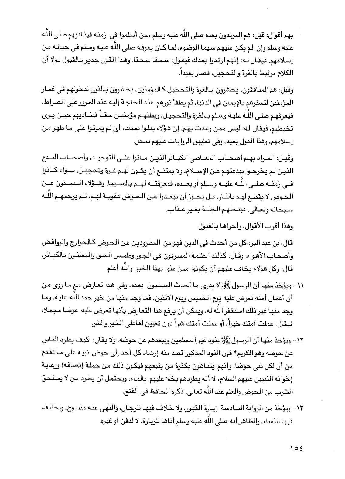 12 - ويؤخذ منها أن الرسول صلى الله عليه وسلم يذود غير المسلمين ويبعدهم عن حوضه، ولا يقال: كيف يطرد الناس عن حوضه وهو الكريم؟ فإن الذود المذكور قصد منه إرشاد كل أحد إلى حوض نبيه على ما تقدم من أن لكل نبي حوضا، وأنهم يتباهون بكثرة من يتبعهم فيكون ذلك من جملة إنصافه؛ ورعاية إخوانه النبيين عليهم السلام، لا أنه يطردهم بخلا عليهم بالماء، ويحتمل أن يطرد من لا يستحق الشرب من الحوض والعلم عند الله تعالى. ذكره الحافظ في الفتح.
