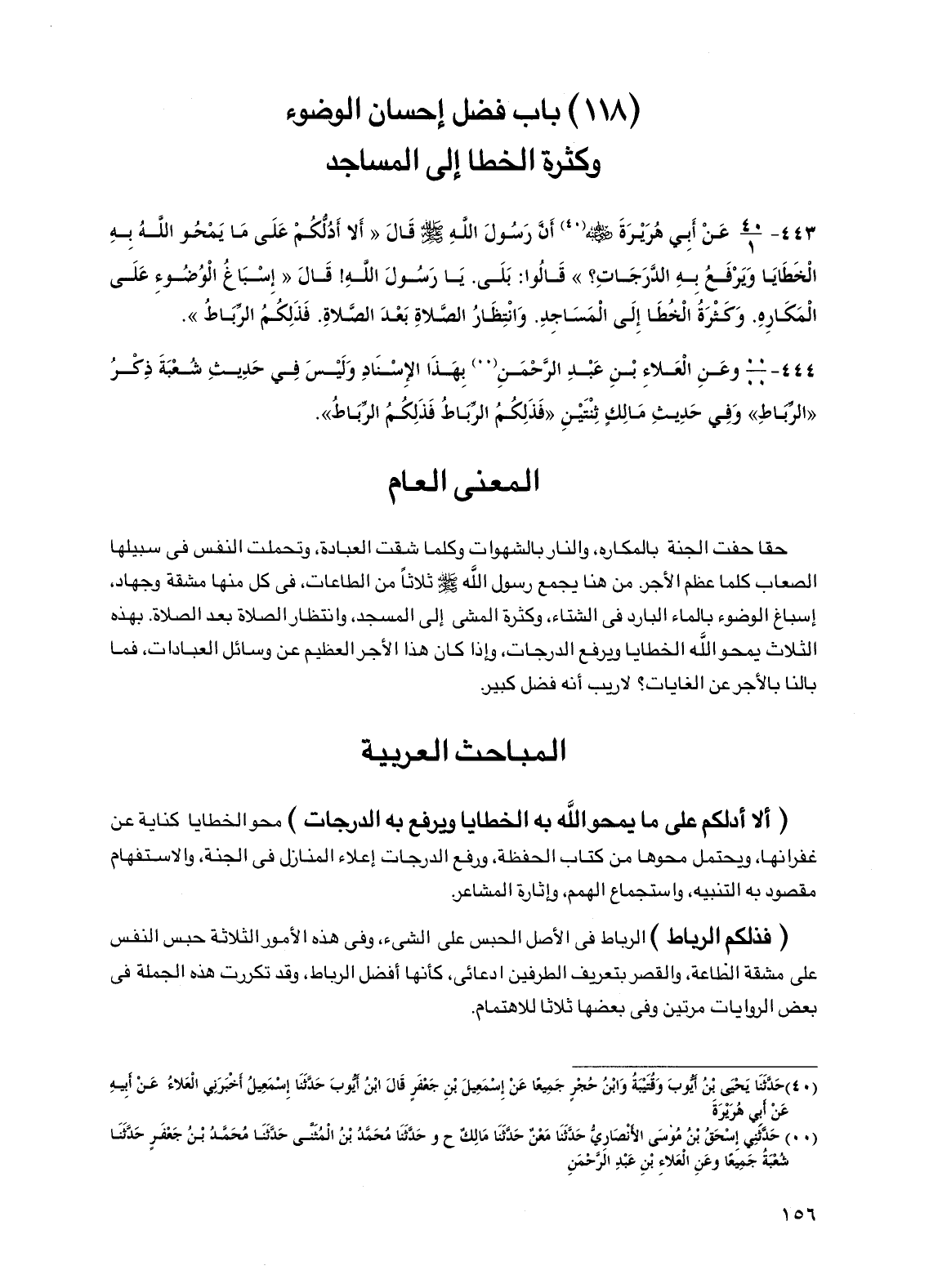 443 - عن أبي هريرة رضي الله عنه أن رسول الله صلى الله عليه وسلم قال "ألا أدلكم على ما يمحو الله به الخطايا ويرفع به الدرجات؟ " قالوا: بلى. يا رسول الله! قال "إسباغ الوضوء على المكاره. وكثرة الخطا إلي المساجد. وانتظار الصلاة بعد الصلاة. فذلكم الرباط".