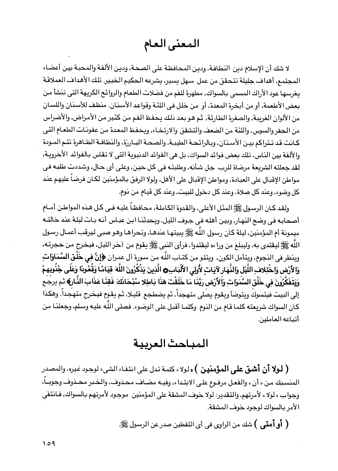 لا شك أن الإسلام دين النظافة، ودين المحافظة على الصحة، ودين الألفة والمحبة بين أعضاء المجتمع، أهداف جليلة تتحقق من عمل سهل يسير، يشرعه الحكيم الخبير. تلك الأهداف العملاقة يغرسها عود الأراك المسمى بالسواك، مطهرة للفم من فضلات الطعام والروائح الكريهة التي تنشأ من بعض الأطعمة، أو من أبخرة المعدة، أو من خلل في اللثة وقواعد الأسنان. منظف للأسنان واللسان من الألوان الغريبة، والصفرة الطارئة، ثم هو بعد ذلك يحفظ الفم من كثير من الأمراض، والأضراس من الحفر والسوس، واللثة من الضعف والتشقق والارتخاء، ويحفظ المعدة من عفونات الطعام التي كانت قد تتراكم بين الأسنان، وبالرائحة الطيبة، والصحة البارزة، والنظافة الظاهرة تتم المودة والألفة بين الناس، تلك بعض فوائد السواك، بل هي الفوائد الدنيوية التي لا تقاس بالفوائد الأخروية، لقد جعلته الشريعة مرضاة للرب جل شأنه، وطلبته في كل حين، وعلى أي حال، وشددت طلبه في مواطن الإقبال على العبادة، ومواطن الإقبال على الأهل، ولولا الرفق بالمؤمنين لكان فرضا عليهم عند كل وضوء، وعند كل صلاة، وعند كل دخول للبيت، وعند كل قيام من نوم.