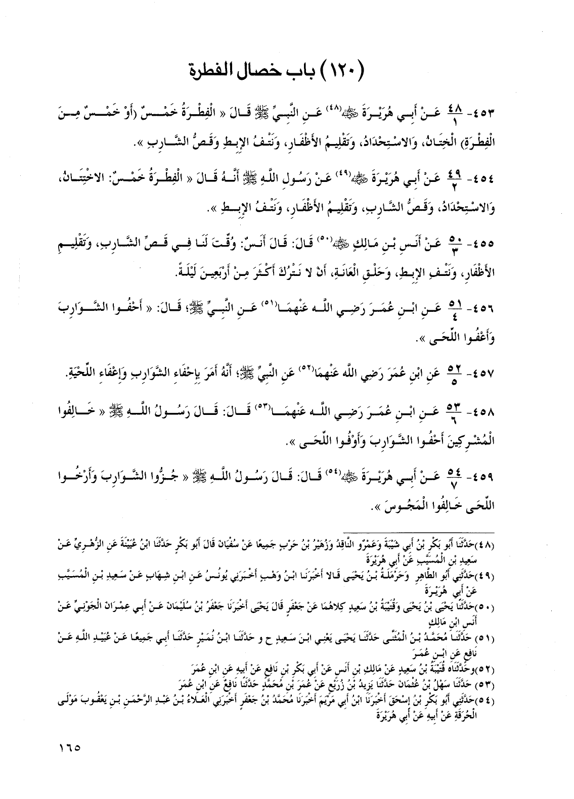 454 - عن أبي هريرة رضي الله عنه عن رسول الله صلى الله عليه وسلم أنه قال "الفطرة خمس: الاختتان، والاستحداد، وقص الشارب، وتقليم الأظفار، ونتف الإبط".