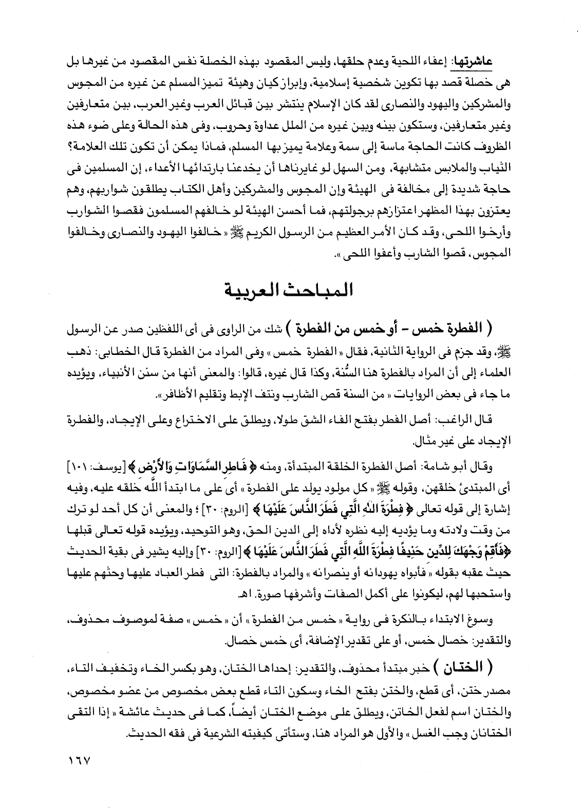 (الفطرة خمس -أو خمس من الفطرة) شك من الراوي في أي اللفظين صدر عن الرسول صلى الله عليه وسلم، وقد جزم في الرواية الثانية، فقال "الفطرة خمس" وفي المراد من الفطرة قال الخطابي: ذهب العلماء إلى أن المراد بالفطرة هنا السنة، وكذا قال غيره، قالوا: والمعنى أنها من سنن الأنبياء، ويؤيده ما جاء في بعض الروايات "من السنة قص الشارب ونتف الإبط وتقليم الأظافر".