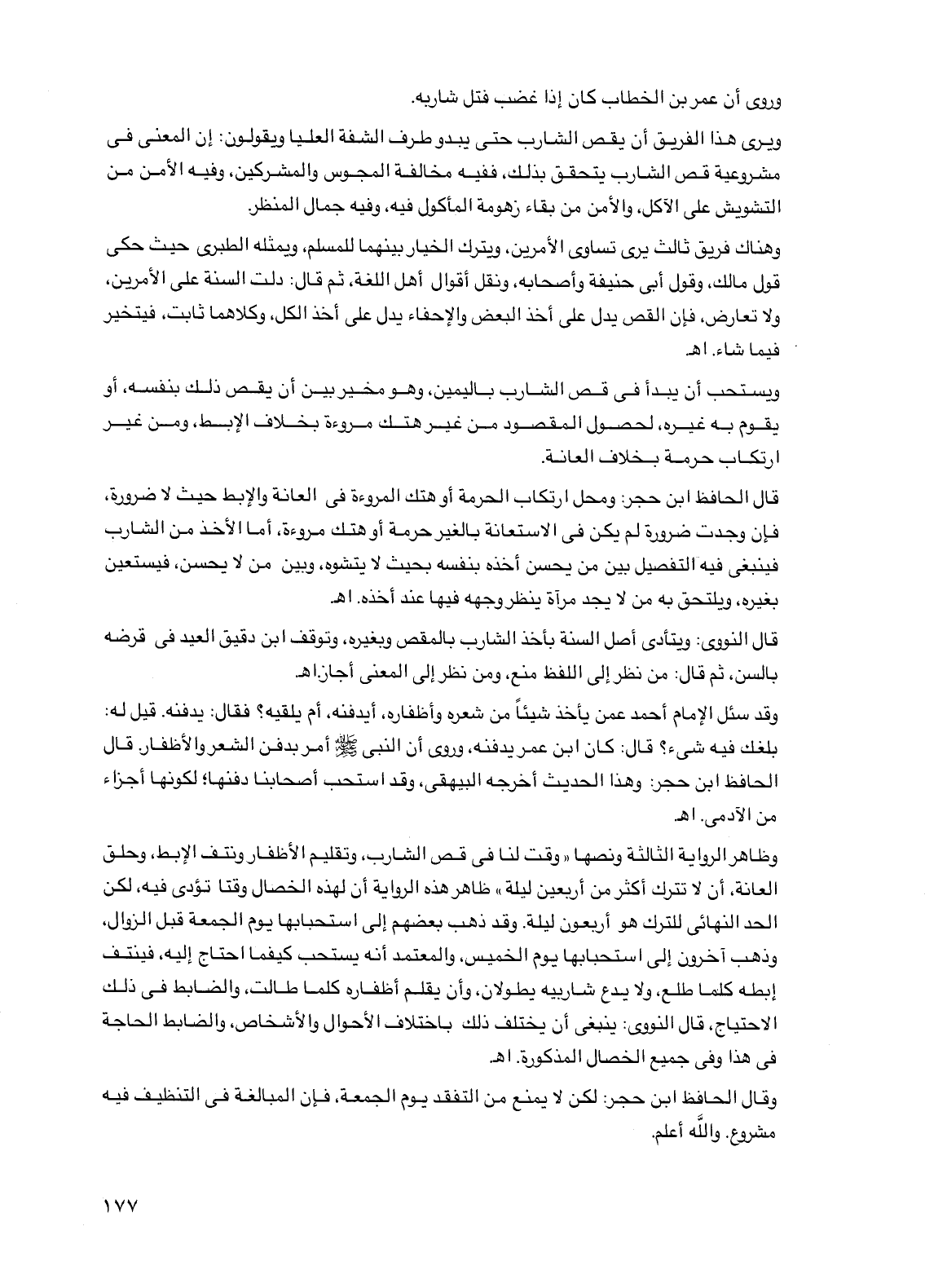 وهناك فريق ثالث يرى تساوي الأمرين، ويترك الخيار بينهما للمسلم، ويمثله الطبري حيث حكى قول مالك، وقول أبي حنيفة وأصحابه، ونقل أقوال أهل اللغة، ثم قال: دلت السنة على الأمرين، ولا تعارض، فإن القص يدل على أخذ البعض والإحفاء يدل على أخذ الكل، وكلاهما ثابت، فيتخير فيما شاء. اهـ.