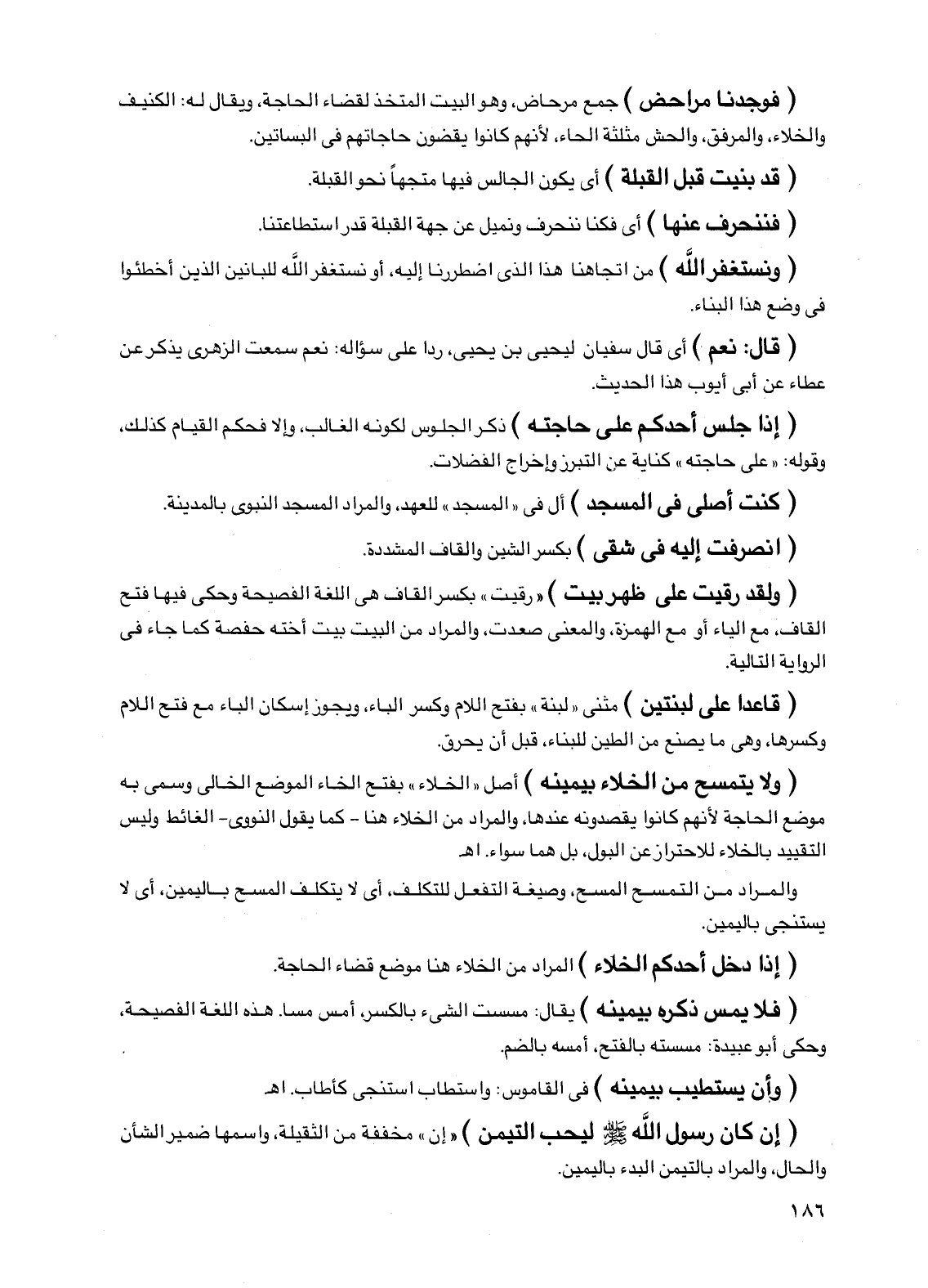 (ولا يتمسح من الخلاء بيمينه) أصل "الخلاء" بفتح الخاء الموضع الخالي وسمي به موضع الحاجة لأنهم كانوا يقصدونه عندها، والمراد من الخلاء هنا -كما يقول النووي- الغائط وليس التقييد بالخلاء للاحتراز عن البول، بل هما سواء. اهـ.