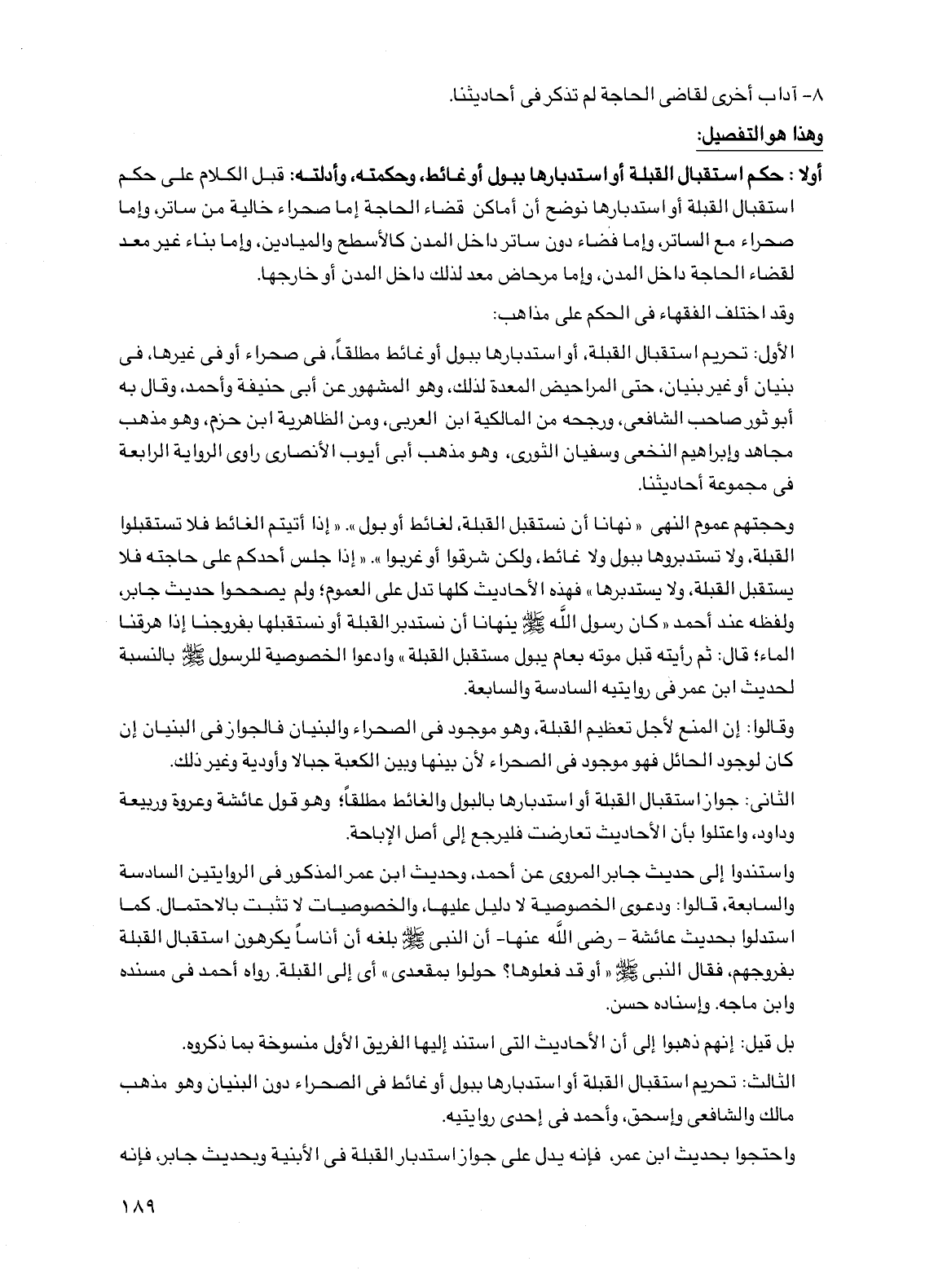 وحجتهم عموم النهي "نهانا أن نستقبل القبلة، لغائط أو بول". إذا أتيتم الغائط فلا تستقبلوا القبلة، ولا تستدبروها ببول ولا غائط، ولكن شرقوا أو غربوا". "إذا جلس أحدكم على حاجته فلا يستقبل القبلة، ولا يستدبرها" فهذه الأحاديث كلها تدل على العموم؛ ولم يصححوا حديث جابر، ولفظه عند أحمد "كان رسول الله صلى الله عليه وسلم ينهانا أن نستدبر القبلة أو نستقبلها بفروجنا إذا هرقنا الماء؛ قال: ثم رأيته قبل موته بعام يبول مستقبل القبلة" وادعوا الخصوصية للرسول صلى الله عليه وسلم بالنسبة لحديث ابن عمر في روايتيه السادسة والسابعة.