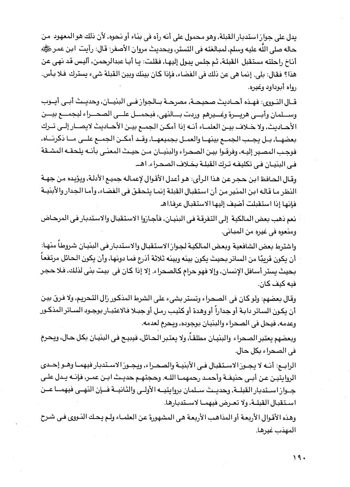 وقال الحافظ ابن حجر عن هذا الرأي: هو أعدل الأقوال لإعماله جميع الأدلة، ويؤيده من جهة النظر ما قاله ابن المنبر من أن استقبال القبلة إنما يتحقق في الفضاء، وأما الجدار والأبنية فإنها إذا استقبلت أضيف إليها الاستقبال عرفا. اهـ.