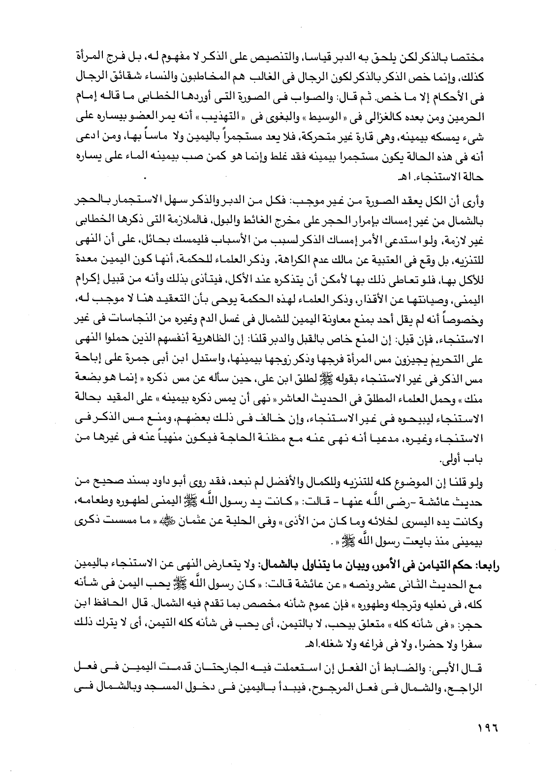 مختصا بالذكر لكن يلحق به الدبر قياسا، والتنصيص على الذكر لا مفهوم له، بل فرج المرأة كذلك، وإنما خص الذكر بالذكر لكون الرجال في الغالب هم المخاطبون والنساء شقائق الرجال في الأحكام إلا ما خص. ثم قال: والصواب في الصورة التي أوردها الخطابي ما قاله إمام الحرمين ومن بعده كالغزالي في "الوسيط" والبغوي في "التهذيب" أنه يمر العضو بيساره على شيء يمسكه بيمينه، وهي قارة غير متحركة، فلا يعد مستجمرا باليمين ولا ماسا بها، ومن ادعى أنه في هذه الحالة يكون مستجمرا بيمينه فقد غلط وإنما هو كمن صب بيمينه الماء على يساره حالة الاستنجاء. اهـ.