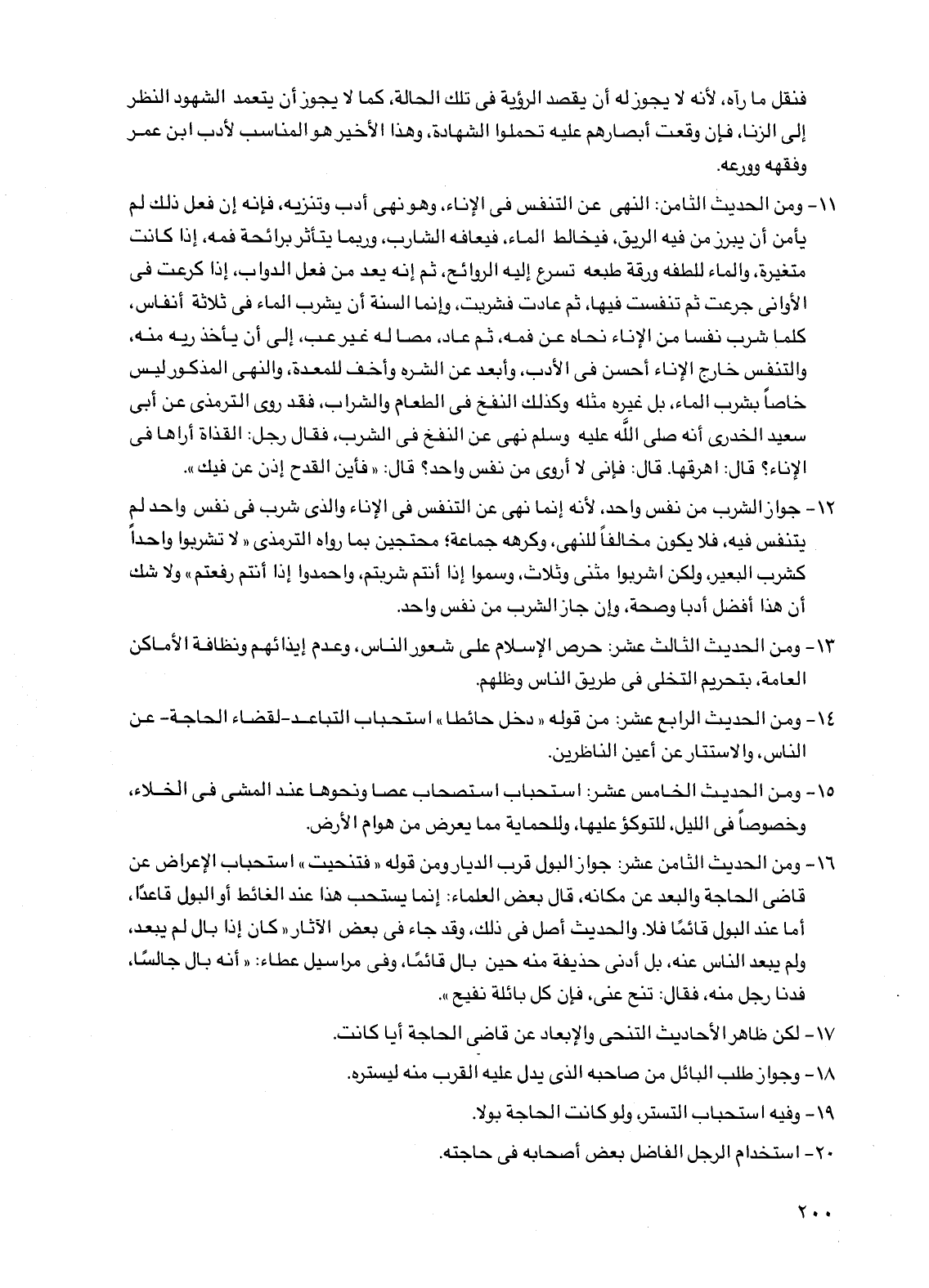 11 - ومن الحديث الثامن: النهي عن التنفس في الإناء، وهو نهي أدب وتنزيه، فإنه إن فعل ذلك لم يأمن أن يبرز من فيه الريق، فيخالط الماء، فيعافه الشارب، وربما يتأثر برائحة فمه، إذا كانت متغيرة، والماء للطفه ورقة طبعه تسرع إليه الروائح، ثم إنه يعد من فعل الدواب، إذا كرعت في الأواني جرعت ثم تنفست فيها، ثم عادت فشربت، وإنما السنة أن يشرب الماء في ثلاثة أنفاس، كلما شرب نفسا من الإناء نحاه عن فمه، ثم عاد، مصا له غير عب، إلى أن يأخذ ريه منه، والتنفس خارج الإناء أحسن في الأدب، وأبعد عن الشره وأخف للمعدة، والنهي المذكور ليس خاصا بشرب الماء، بل غيره مثله وكذلك النفخ في الطعام والشراب، فقد روى الترمذي عن أبي سعيد الخدري أنه صلى الله عليه وسلم نهى عن النفخ في الشرب، فقال رجل: القذاة أراها في الإناء؟ قال: اهرقها. قال: فإني لا أروى من نفس واحد؟ قال: "فأين القدح إذن عن فيك".