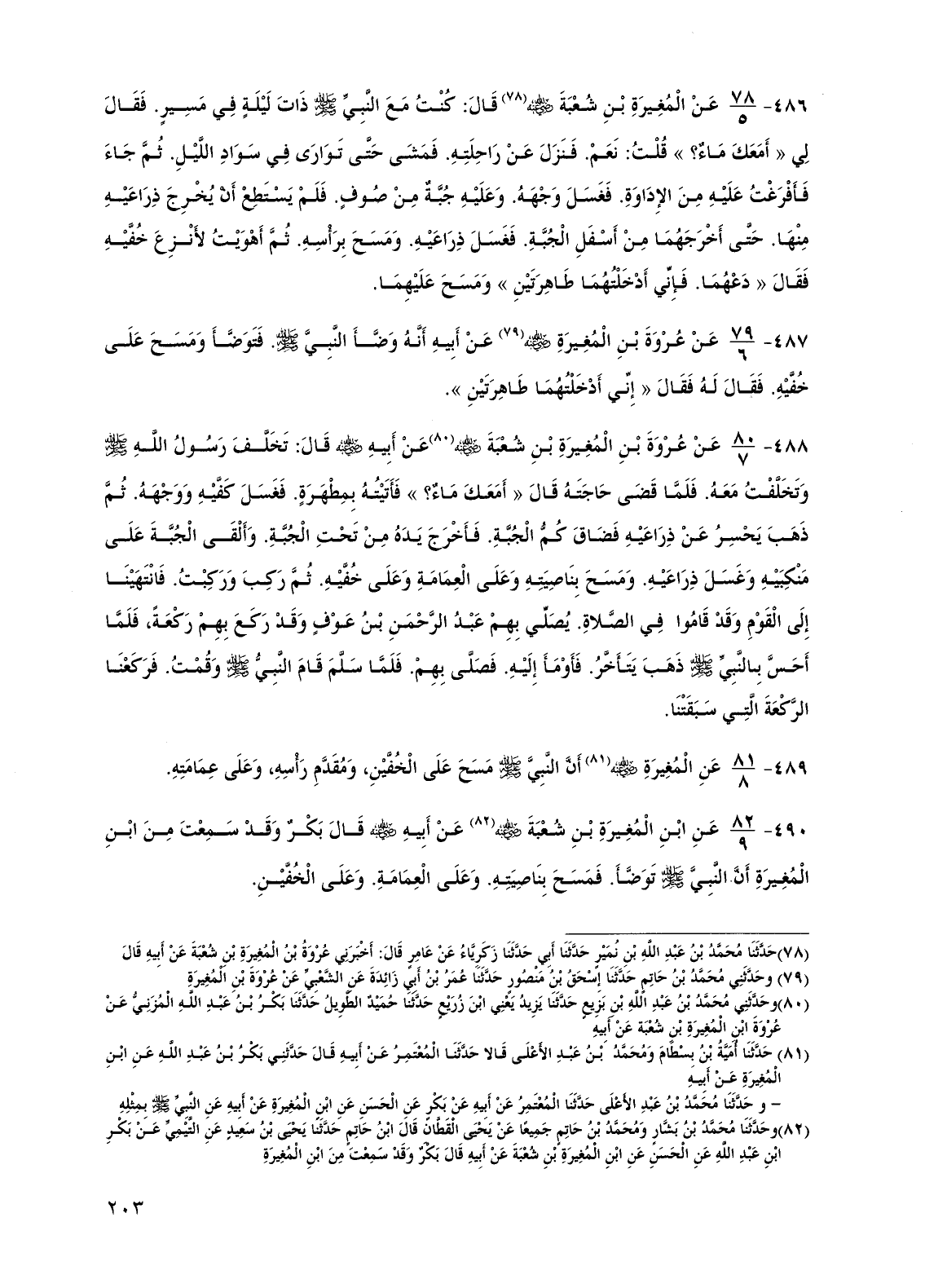 490 - عن ابن المغيرة بن شعبة رضي الله عنه عن أبيه رضي الله عنه قال بكر وقد سمعت من ابن المغيرة أن النبي صلى الله عليه وسلم توضأ. فمسح بناصيته. وعلى العمامة. وعلى الخفين.