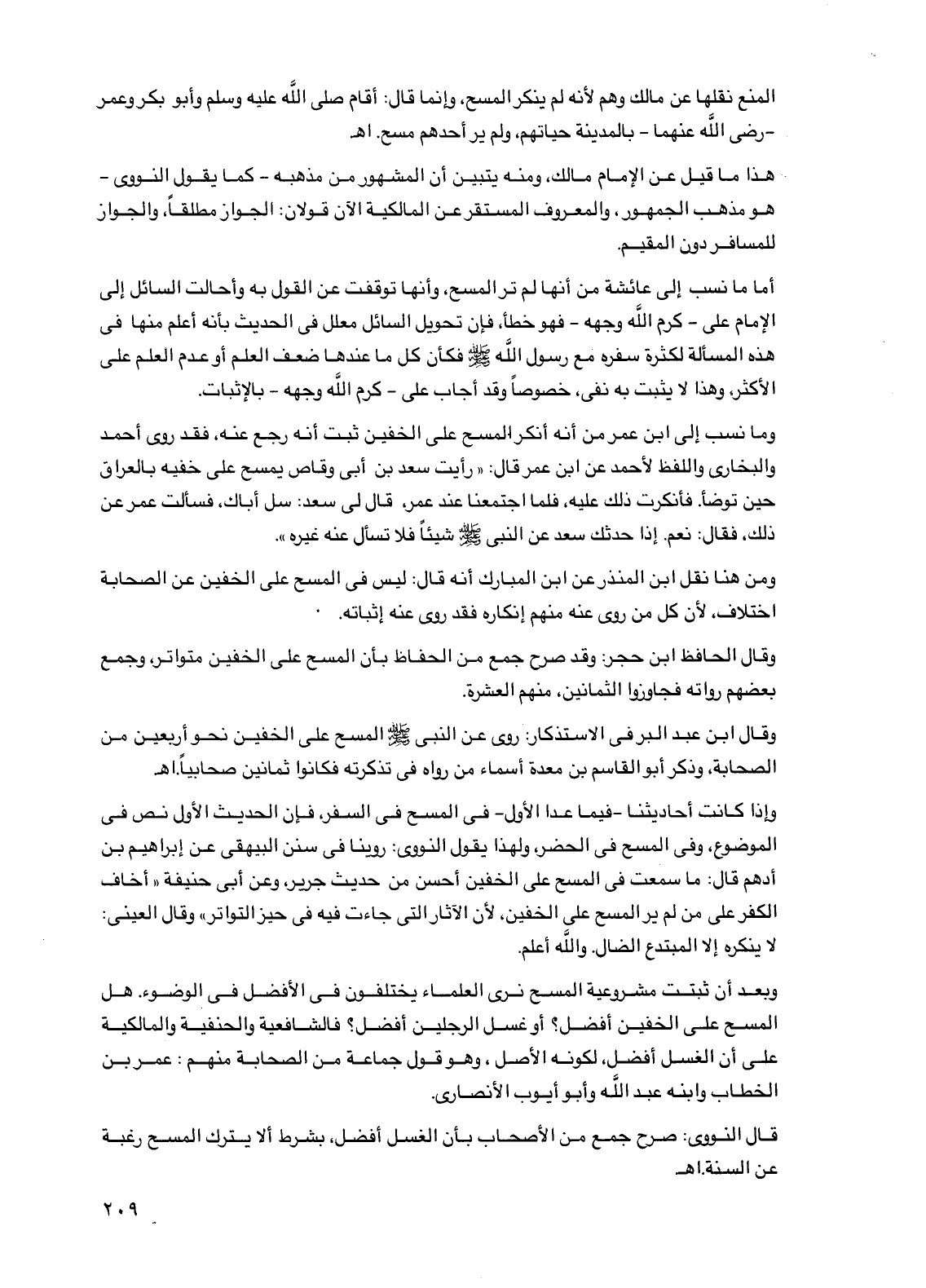 وإذا كانت أحاديثنا -فيما عدا الأول- في المسح في السفر، فإن الحديث الأول نص في الموضوع، وفي المسح في الحضر، ولهذا يقول النووي: روينا في سنن البيهقي عن إبراهيم بن أدهم قال: ما سمعت في المسح على الخفين أحسن من حديث جرير، وعن أبي حنيفة "أخاف الكفر على من لم ير المسح على الخفين، لأن الآثار التي جاءت فيه في حيز التواتر" وقال العيني: لا ينكره إلا المبتدع الضال. والله أعلم.