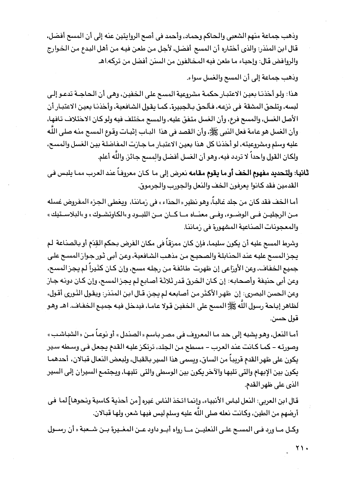 هذا: ولو أخذنا بعين الاعتبار حكمة مشروعية المسح على الخفين، وهي أن الحاجة تدعو إلى لبسه، وتلحق المشقة في نزعه، فألحق بالجبيرة، كما يقول الشافعية، وأخذنا بعين الاعتبار أن الأصل الغسل، والمسح فرع، وأن الغسل متفق عليه، والمسح مختلف فيه ولو كان الاختلاف تافها، وأن الغسل هو عامة فعل النبي صلى الله عليه وسلم، وأن القصد في هذا الباب إثبات وقوع المسح منه صلى الله عليه وسلم ومشروعيته، لو أخذنا كل هذا بعين الاعتبار ما جازت المفاضلة بين الغسل والمسح، ولكان القول واحدا لا تردد فيه، وهو أن الغسل أفضل والمسح جائز. والله أعلم.