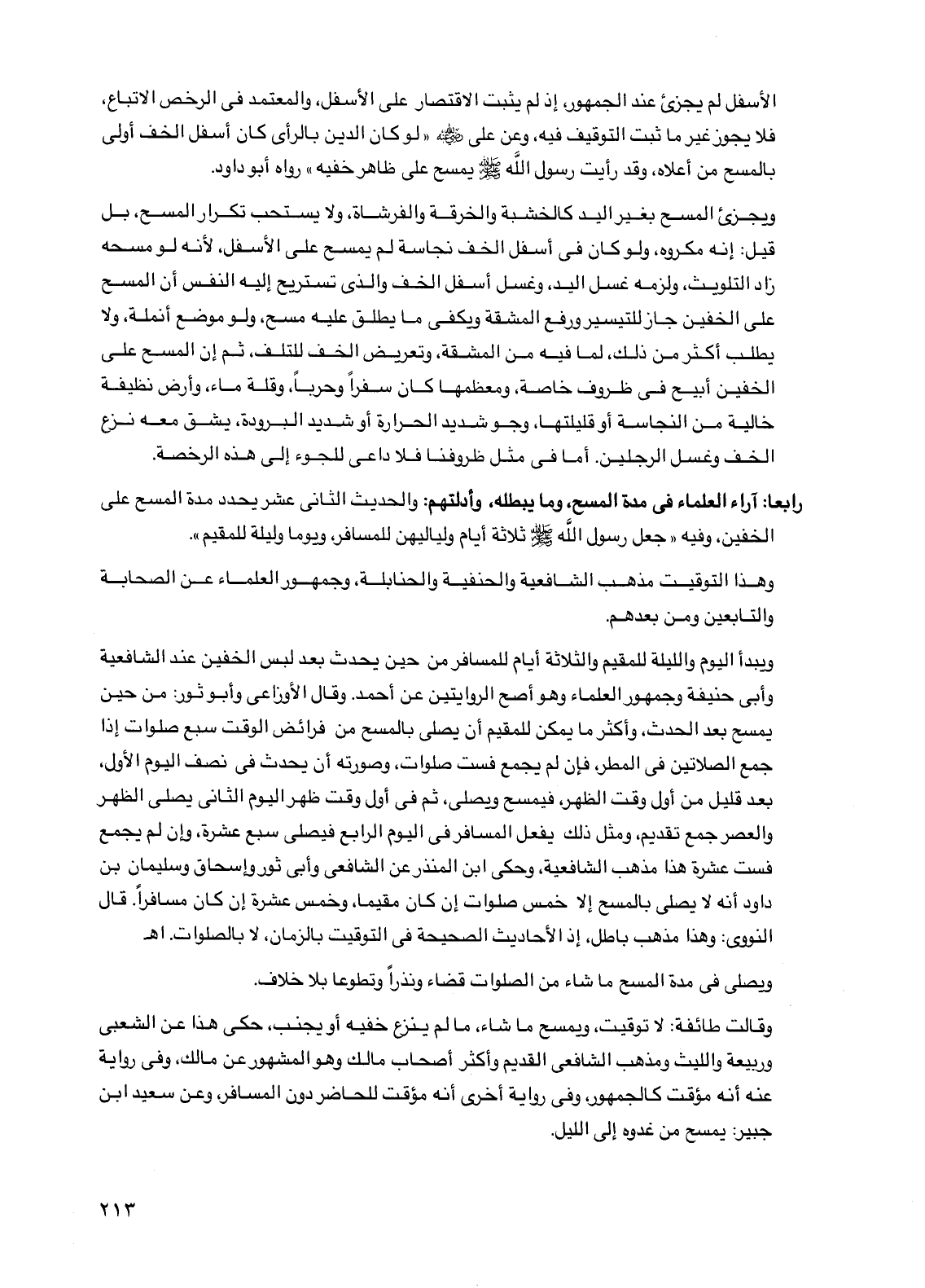 رابعا: آراء العلماء في مدة المسح، وما يبطله، وأدلتهم: والحديث الثاني عشر يحدد مدة المسح على الخفين، وفيه "جعل رسول الله صلى الله عليه وسلم ثلاثة أيام ولياليهن للمسافر، ويوما وليلة للمقيم".