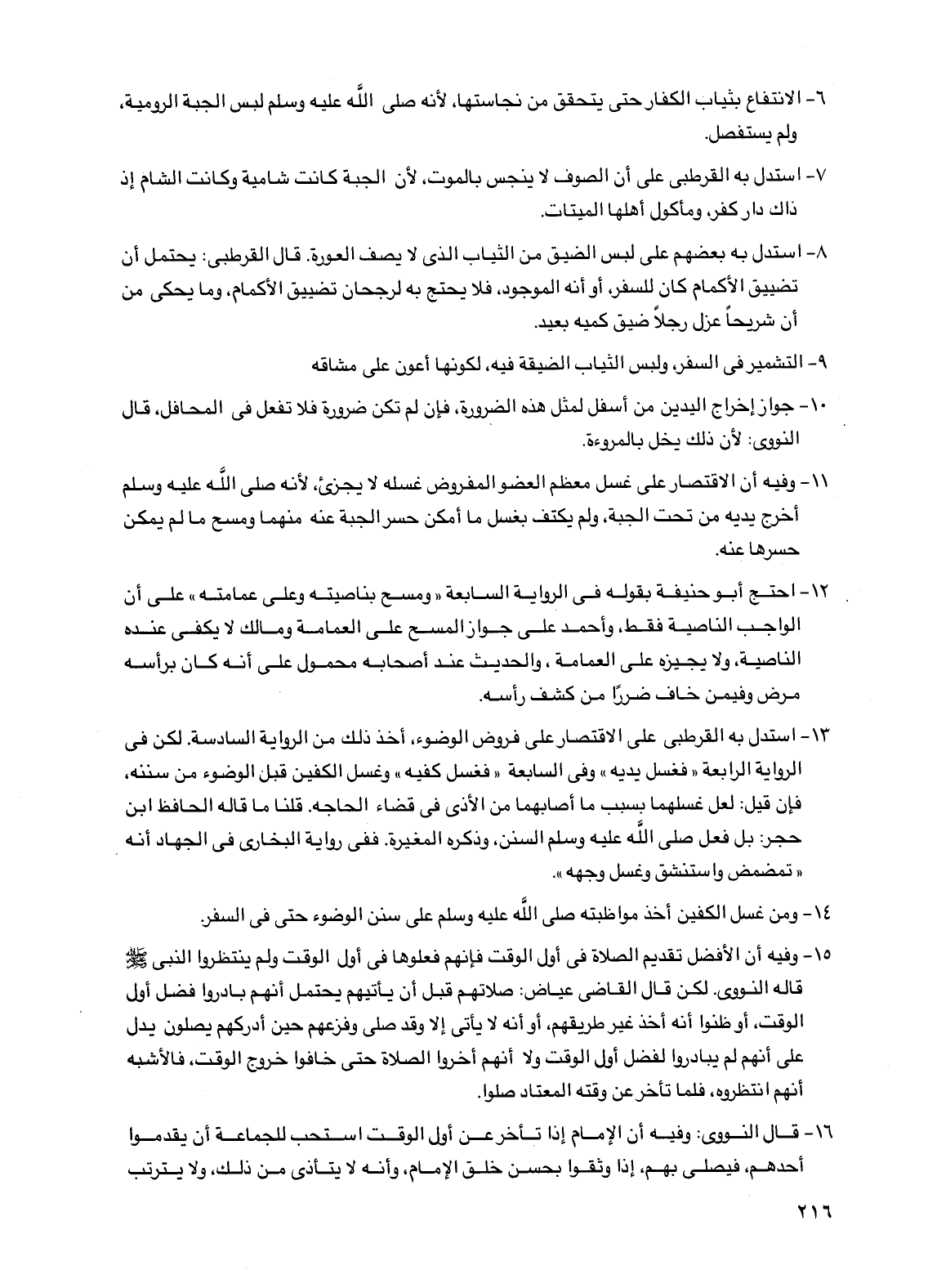 11 - وفيه أن الاقتصار على غسل معظم العضو المفروض غسله لا يجزئ، لأنه صلى الله عليه وسلم أخرج يديه من تحت الجبة، ولم يكتف بغسل ما أمكن حسر الجبة عنه منهما ومسح ما لم يمكن حسرها عنه.