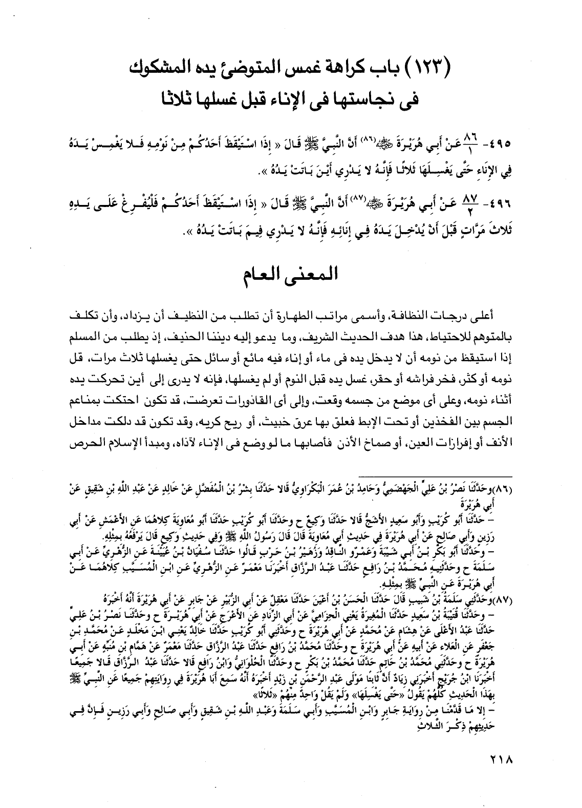 496 - عن أبي هريرة رضي الله عنه أن النبي صلى الله عليه وسلم قال "إذا استيقظ أحدكم فليفرغ على يده ثلاث مرات قبل أن يدخل يده في إنائه فإنه لا يدري فيم باتت يده".