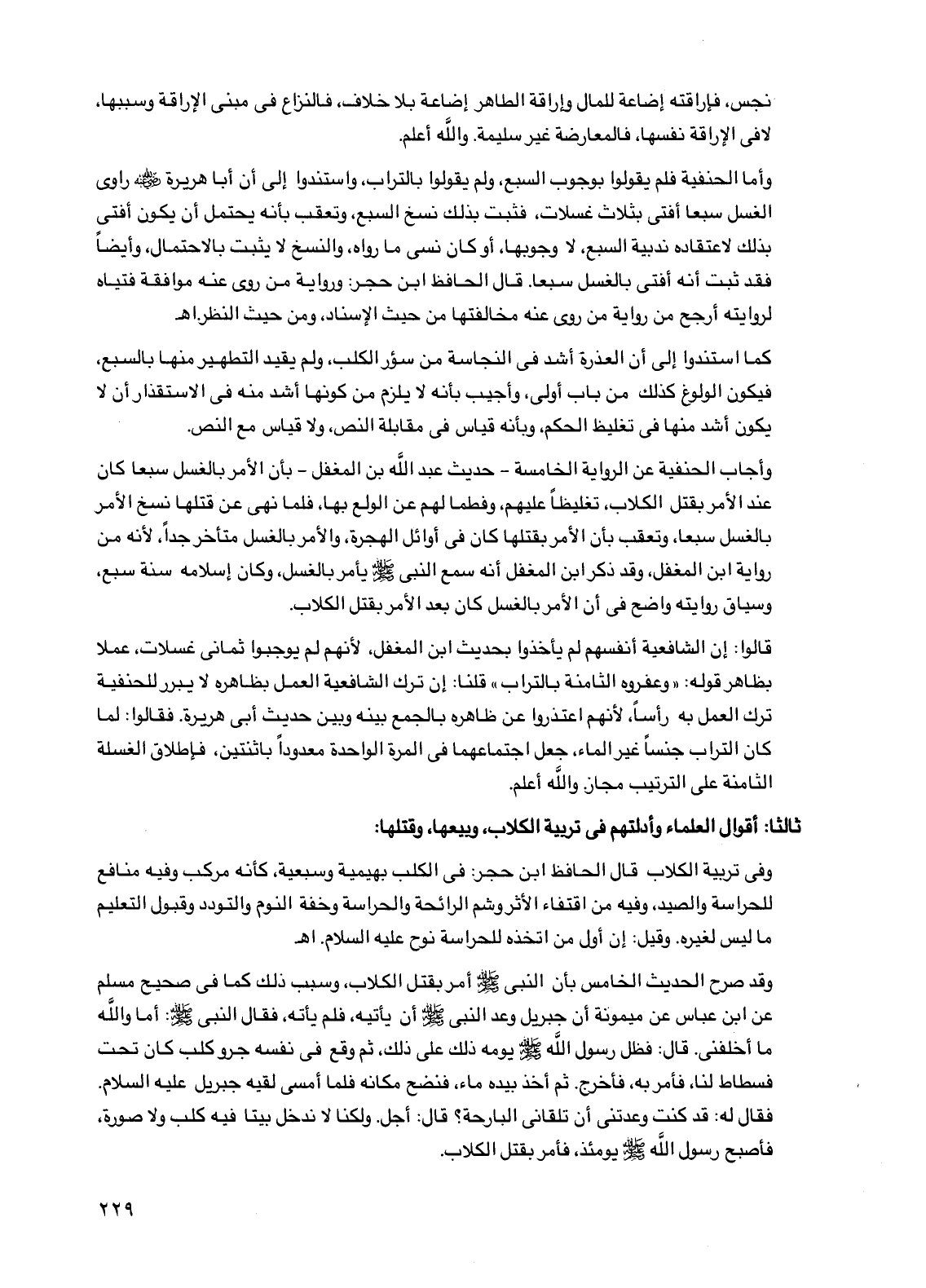 وأجاب الحنفية عن الرواية الخامسة -حديث عبد الله بن المغفل- بأن الأمر بالغسل سبعا كان عند الأمر بقتل الكلاب، تغليظا عليهم، وفطما لهم عن الولع بها، فلما نهي عن قتلها نسخ الأمر بالغسل سبعا، وتعقب بأن الأمر بقتلها كان في أوائل الهجرة، والأمر بالغسل متأخر جدا، لأنه من رواية ابن المغفل، وقد ذكر ابن المغفل أنه سمع النبي صلى الله عليه وسلم يأمر بالغسل، وكان إسلامه سنة سبع، وسياق روايته واضح في أن الأمر بالغسل كان بعد الأمر بقتل الكلاب.