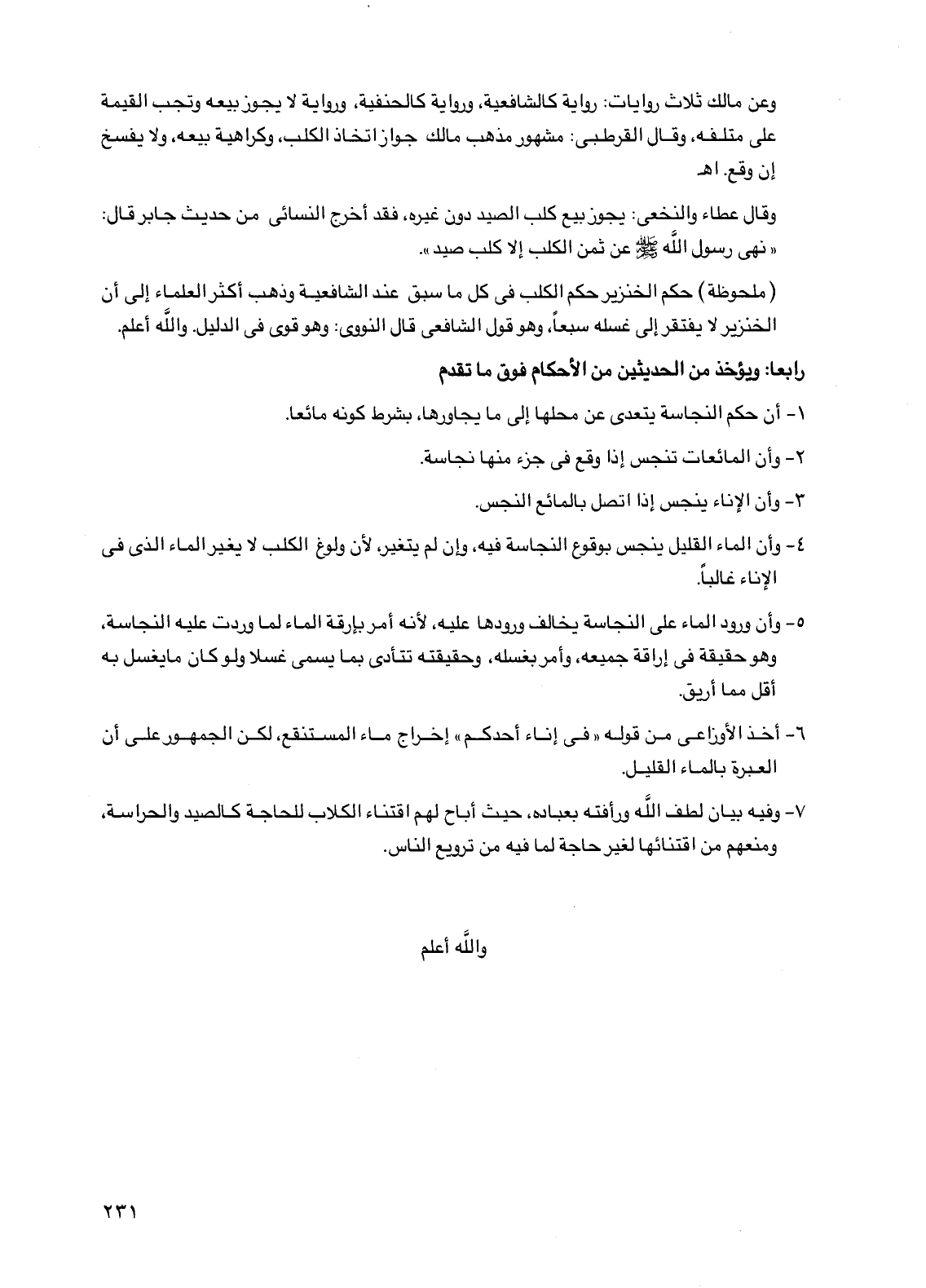 (ملحوظة) حكم الخنزير حكم الكلب في كل ما سبق عند الشافعية وذهب أكثر العلماء إلى أن الخنزير لا يفتقر إلى غسله سبعا، وهو قول الشافعي قال النووي: وهو قوي في الدليل. والله أعلم.
