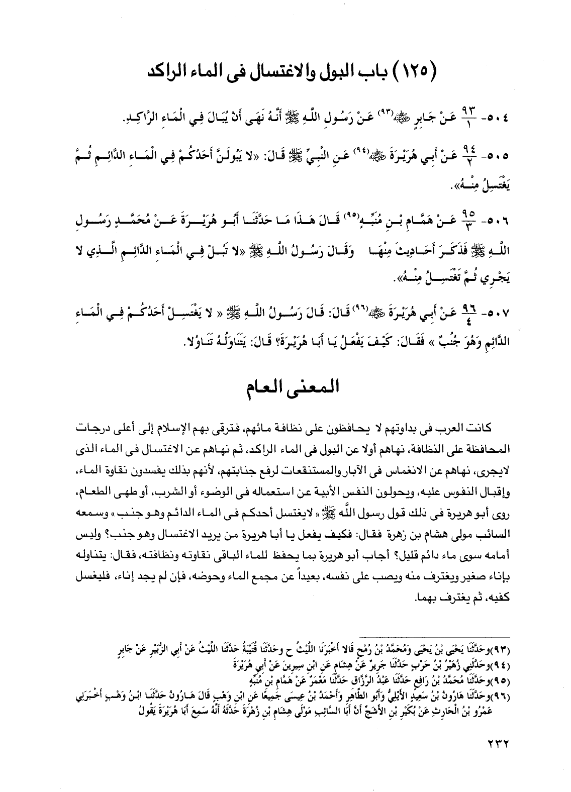 505 - عن أبي هريرة رضي الله عنه عن النبي صلى الله عليه وسلم قال: "لا يبولن أحدكم في الماء الدائم ثم يغتسل منه".