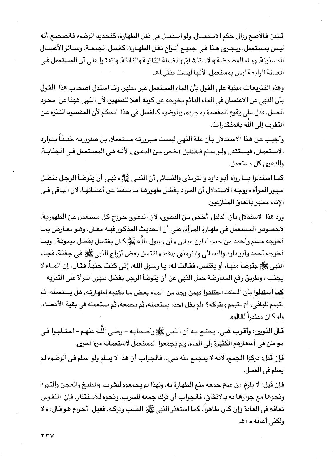 ورد هذا الاستدلال بأن الدليل أخص من الدعوى، لأن الدعوى خروج كل مستعمل عن الطهورية، لا خصوص المستعمل في طهارة المرأة، على أن الحديث المذكور فيه مقال، وهو معارض بما أخرجه مسلم وأحمد من حديث ابن عباس "أن رسول الله صلى الله عليه وسلم كان يغتسل بفضل ميمونة" وبما أخرجه أحمد وأبو داود والنسائي والترمذي بلفظ "اغتسل بعض أزواج النبي صلى الله عليه وسلم في جفنة، فجاء النبي صلى الله عليه وسلم ليتوضأ منها، أو يغتسل، فقالت له: يا رسول الله، إني كنت جنبا. فقال: إن الماء لا يجنب" وطريق رفع المعارضة حمل النهي عن أن يتوضأ الرجل بفضل طهور المرأة على التنزيه.