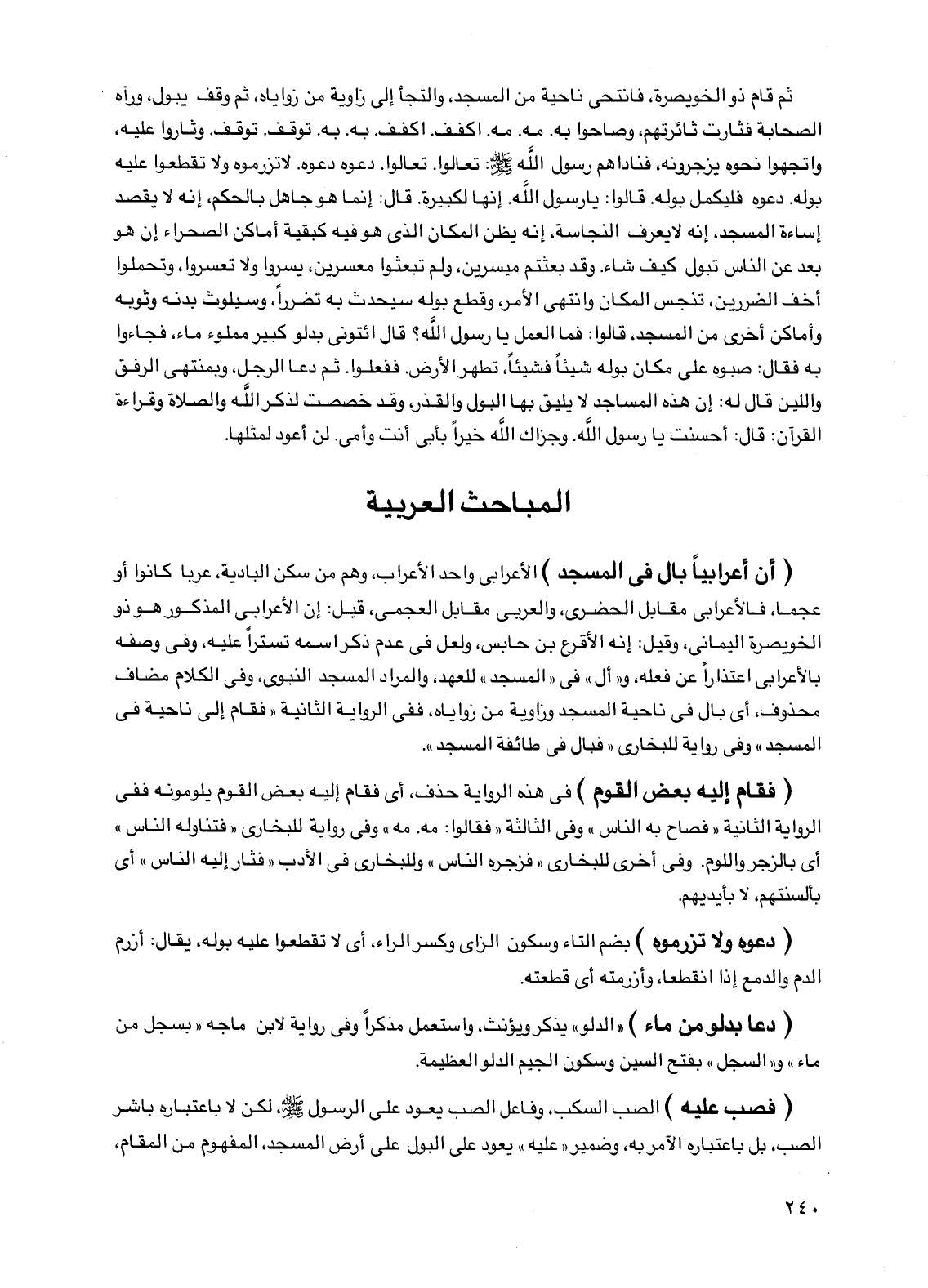 (أن أعرابيا بال في المسجد) الأعرابي واحد الأعراب، وهم من سكن البادية، عربا كانوا أو عجما، فالأعرابي مقابل الحضري، والعربي مقابل العجمي، قيل: إن الأعرابي المذكور هو ذو الخويصرة اليماني، وقيل: إنه الأقرع بن حابس، ولعل في عدم ذكر اسمه تسترا عليه، وفي وصفه بالأعرابي اعتذارا عن فعله، و"أل" في "المسجد" للعهد، والمراد المسجد النبوي، وفي الكلام مضاف محذوف، أي بال في ناحية المسجد وزاوية من زواياه، ففي الرواية الثانية "فقام إلى ناحية في المسجد" وفي رواية للبخاري "فبال في طائفة المسجد".