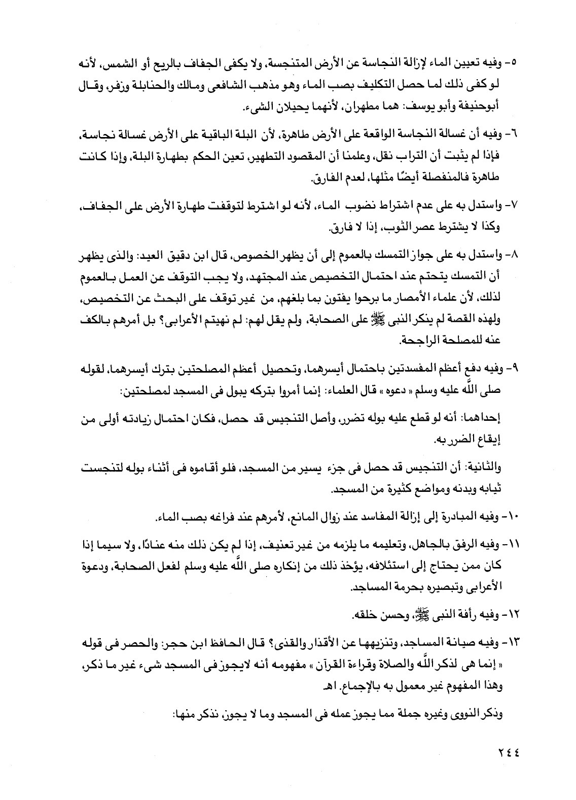 13 - وفيه صيانة المساجد، وتنزيهها عن الأقذار والقذى؟ قال الحافظ ابن حجر: والحصر في قوله "إنما هي لذكر الله والصلاة وقراءة القرآن" مفهومه أنه لا يجوز في المسجد شيء غير ما ذكر، وهذا المفهوم غير معمول به بالإجماع. اهـ.