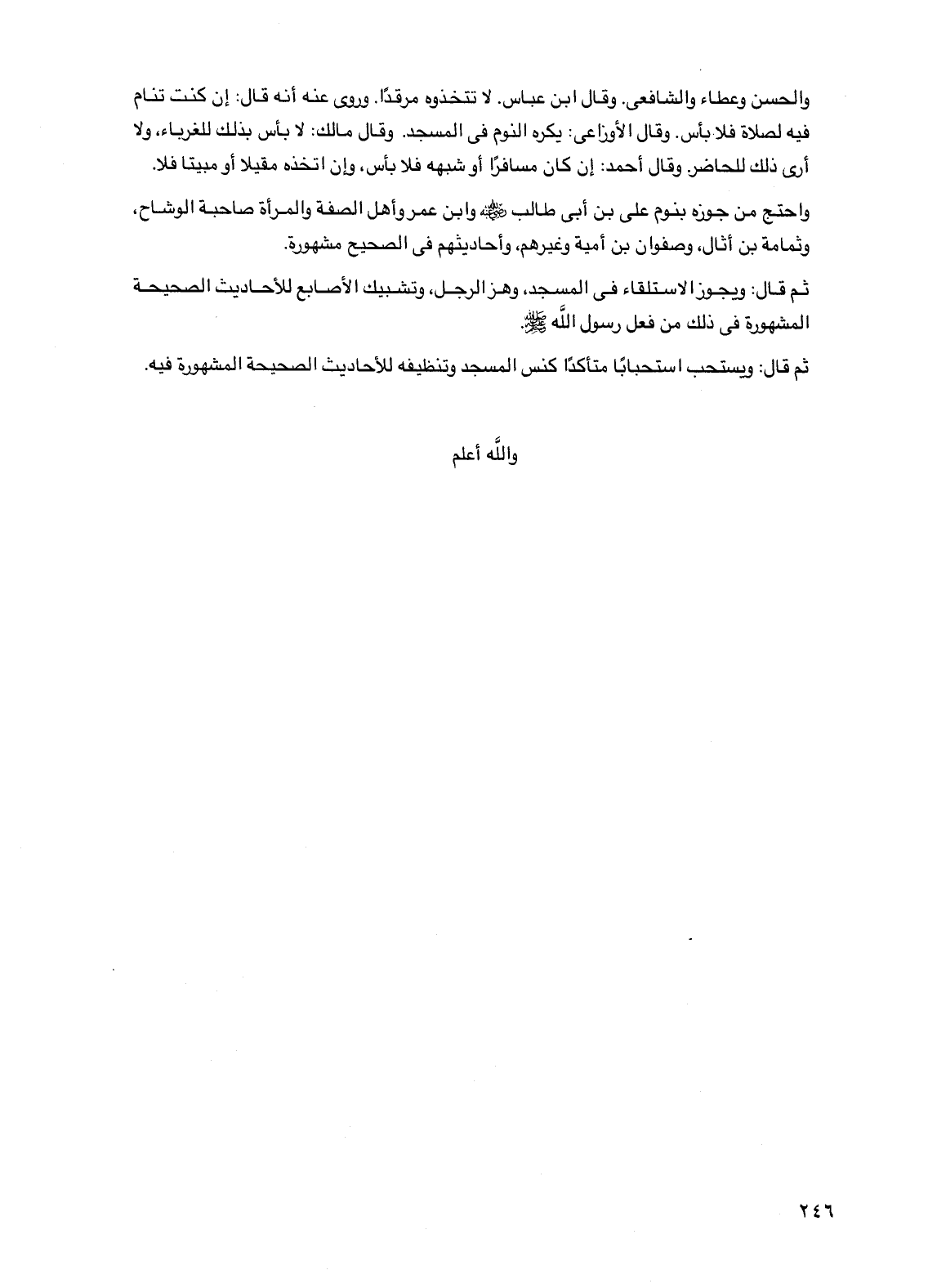 والحسن وعطاء والشافعي. وقال ابن عباس. لا تتخذوه مرقدا. وروي عنه أنه قال: إن كنت تنام فيه لصلاة فلا بأس. وقال الأوزاعي: يكره النوم في المسجد. وقال مالك: لا بأس بذلك للغرباء، ولا أرى ذلك للحاضر. وقال أحمد: إن كان مسافرا أو شبهه فلا بأس، وإن اتخذه مقيلا أو مبيتا فلا.