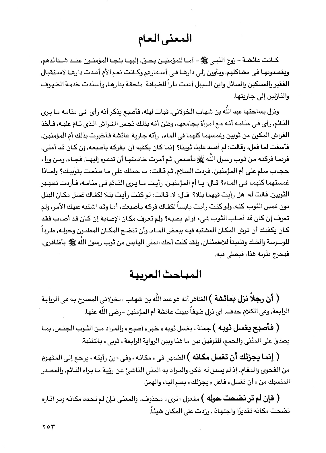 ونزل بساحتها عبد الله بن شهاب الخولاني، فبات ليله، فأصبح يذكر أنه رأى في منامه ما يرى النائم، رأى في منامه أنه مع امرأة يجامعها، وظن أنه بذلك نجس الفراش الذي نام عليه، فأخذ الفراش المكون من ثوبين وغمسهما كلهما في الماء، رأته جارية عائشة فأخبرت بذلك أم المؤمنين، فأسفت لما فعل، وقالت: لم أفسد علينا ثوبنا؟ إنما كان يكفيه أن يفركه بأصبعه، إن كان قد أمنى، فربما فركته من ثوب رسول الله صلى الله عليه وسلم بأصبعي. ثم أمرت خادمتها أن تدعوه إليها. فجاء، ومن وراء حجاب سلم على أم المؤمنين، فردت السلام، ثم قالت: ما حملك على ما صنعت بثوبيك؟ ولماذا غمستهما كلهما في الماء؟ قال: يا أم المؤمنين. رأيت ما يرى النائم في منامه، فأردت تطهير الثوبين. قالت له: هل رأيت فيهما بللا؟ قال: لا. قالت: لو كنت رأيت بللا لكفاك غسل مكان البلل دون غمس الثوب كله، ولو كنت رأيت يابسا لكفاك فركه بأصبعك، أما وقد اشتبه عليك الأمر، ولم تعرف إن كان قد أصاب الثوب شيء أو لم يصبه؟ ولم تعرف مكان الإصابة إن كان قد أصاب فقد كان يكفيك أن ترش المكان المشتبه فيه ببعض الماء، وأن تنضح المكان المظنون وحوله، طردا للوسوسة والشك وتثبيتا للاطمئنان، ولقد كنت أحك المني اليابس من ثوب رسول الله صلى الله عليه وسلم بأظافري، فيخرج بثوبه هذا، فيصلي فيه.