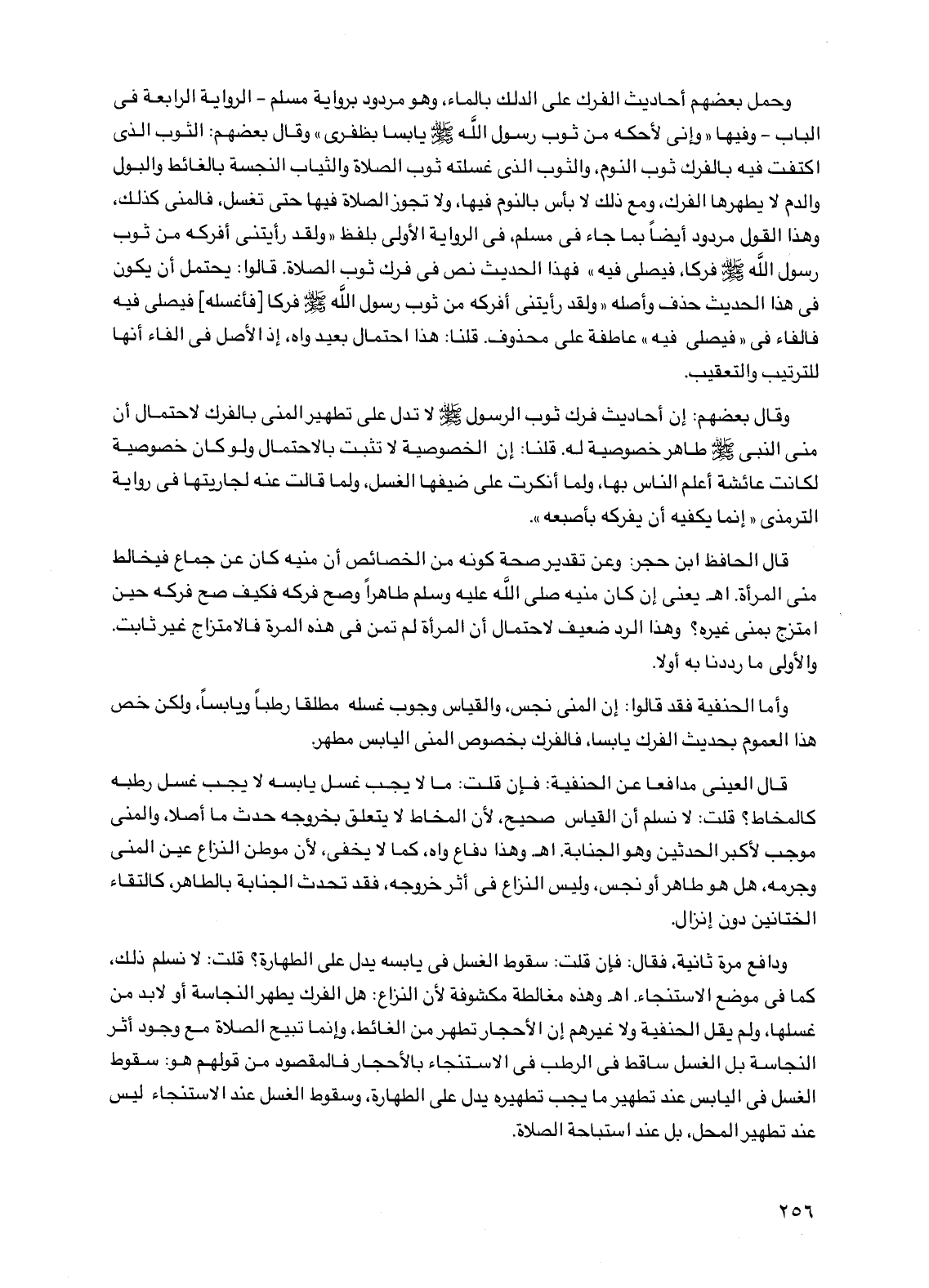 وحمل بعضهم أحاديث الفرك على الدلك بالماء، وهو مردود برواية مسلم -الرواية الرابعة في الباب- وفيها "وإني لأحكه من ثوب رسول الله صلى الله عليه وسلم يابسا بظفري" وقال بعضهم: الثوب الذي اكتفت فيه بالفرك ثوب النوم، والثوب الذي غسلته ثوب الصلاة والثياب النجسة بالغائط والبول والدم لا يطهرها الفرك، ومع ذلك لا بأس بالنوم فيها، ولا تجوز الصلاة فيها حتى تغسل، فالمني كذلك، وهذا القول مردود أيضا بما جاء في مسلم، في الرواية الأولى بلفظ "ولقد رأيتني أفركه من ثوب رسول الله صلى الله عليه وسلم فركا، فيصلي فيه" فهذا الحديث نص في فرك ثوب الصلاة. قالوا: يحتمل أن يكون في هذا الحديث حذف وأصله "ولقد رأيتني أفركه من ثوب رسول الله صلى الله عليه وسلم فركا [فأغسله] فيصلي فيه فالفاء في "فيصلي فيه" عاطفة على محذوف. قلنا: هذا احتمال بعيد واه، إذ الأصل في الفاء أنها للترتيب والتعقيب.
