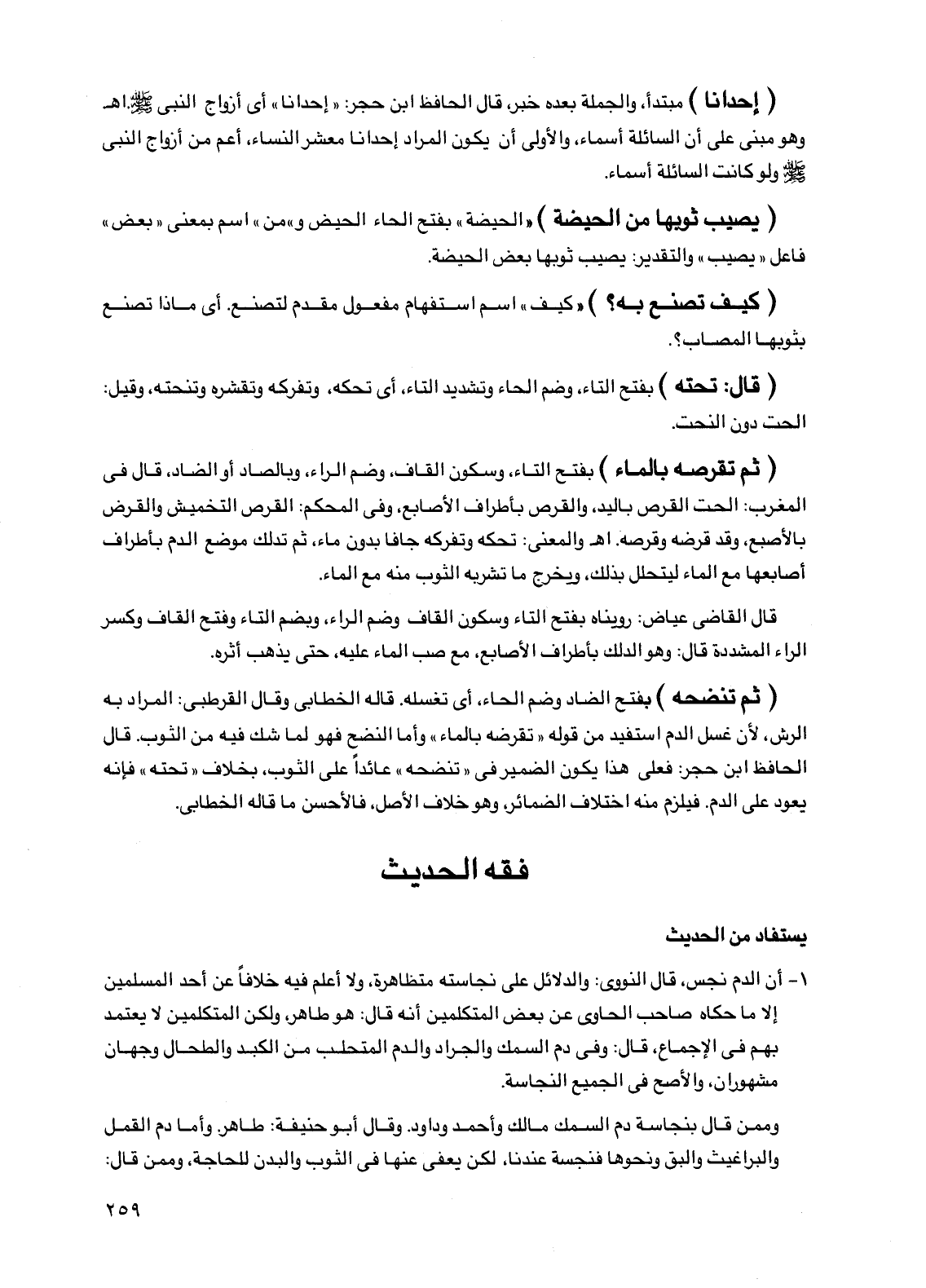 (ثم تنضحه) بفتح الضاد وضم الحاء، أي تغسله. قاله الخطابي وقال القرطبي: المراد به الرش، لأن غسل الدم استفيد من قوله "تقرضه بالماء" وأما النضح فهو لما شك فيه من الثوب. قال الحافظ ابن حجر: فعلى هذا يكون الضمير في "تنضحه" عائدا على الثوب، بخلاف "تحته" فإنه يعود على الدم. فيلزم منه اختلاف الضمائر، وهو خلاف الأصل، فالأحسن ما قاله الخطابي.