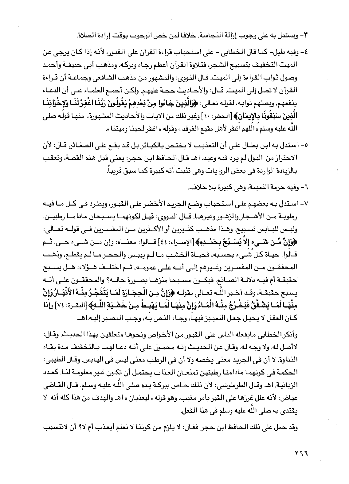 4 - وفيه دليل -كما قال الخطابي- على استحباب قراءة القرآن على القبور، لأنه إذا كان يرجى عن الميت التخفيف بتسبيح الشجر، فتلاوة القرآن أعظم رجاء وبركة. ومذهب أبي حنيفة وأحمد وصول ثواب القراءة إلى الميت. قال النووي: والمشهور من مذهب الشافعي وجماعة أن قراءة القرآن لا تصل إلى الميت. قال: والأحاديث حجة عليهم، ولكن أجمع العلماء على أن الدعاء ينفعهم، ويصلهم ثوابه. لقوله تعالى: {والذين جاءوا من بعدهم يقولون ربنا اغفر لنا ولإخواننا الذين سبقونا بالإيمان} [الحشر: 10] وغير ذلك من الآيات والأحاديث المشهورة، منها قوله صلى الله عليه وسلم "اللهم اغفر لأهل بقيع الغرقد" وقوله "اغفر لحينا وميتنا".