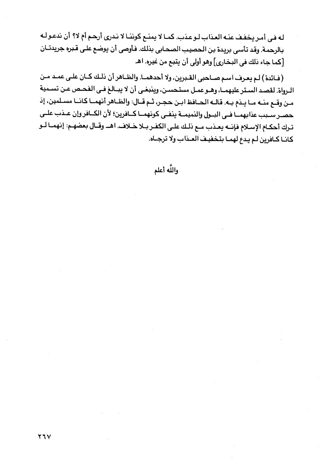(فائدة) لم يعرف اسم صاحبي القبرين، ولا أحدهما. والظاهر أن ذلك كان على عمد من الرواة. لقصد الستر عليهما، وهو عمل مستحسن، وينبغي أن لا يبالغ في الفحص عن تسمية من وقع منه ما يذم به. قاله الحافظ ابن حجر، ثم قال: والظاهر أنهما كانا مسلمين، إذ حصر سبب عذابهما في البول والنميمة ينفي كونهما كافرين؛ لأن الكافر وإن عذب على ترك أحكام الإسلام فإنه يعذب مع ذلك على الكفر بلا خلاف. اهـ. وقال بعضهم: إنهما لو كانا كافرين لم يدع لهما بتخفيف العذاب ولا ترجاه.