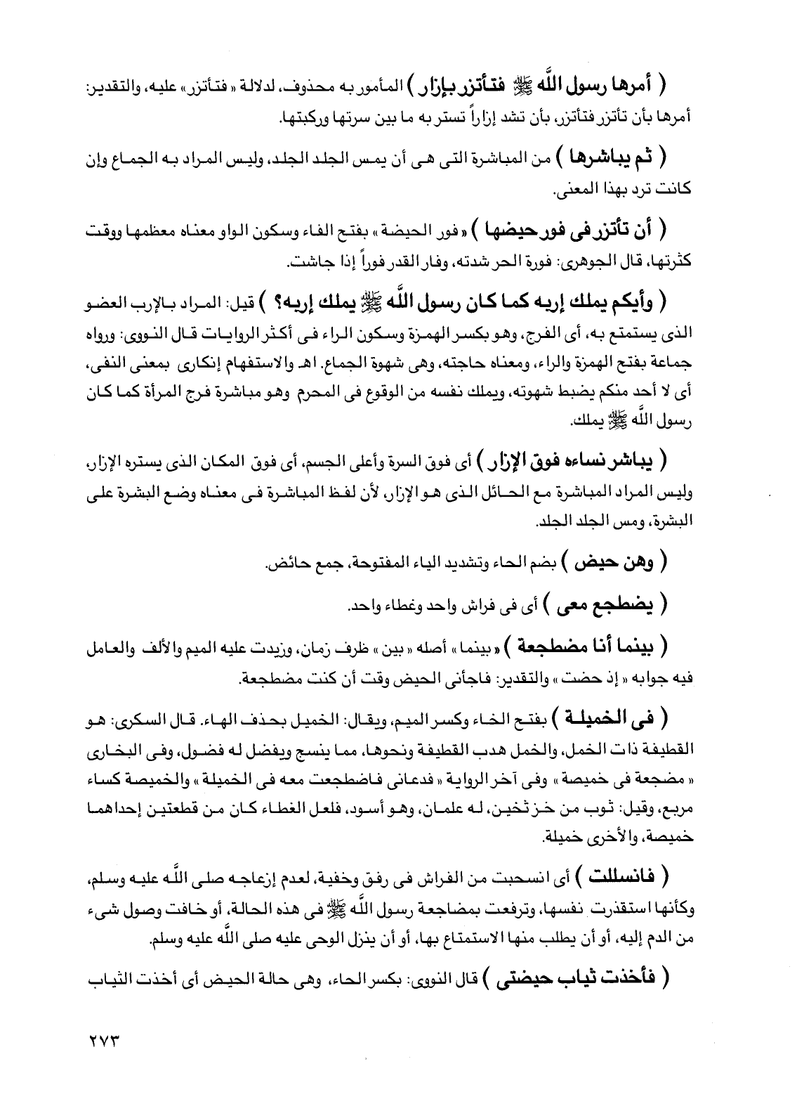 (أمرها رسول الله صلى الله عليه وسلم فتأتزر بإزار) المأمور به محذوف، لدلالة "فتأتزر" عليه، والتقدير: أمرها بأن تأتزر فتأتزر، بأن تشد إزارا تستر به ما بين سرتها وركبتها.
