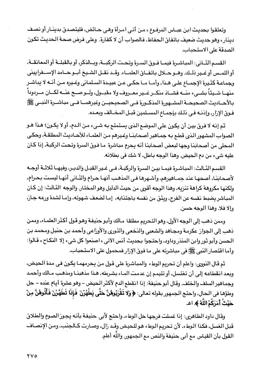 القسم الثاني: المباشرة فيما فوق السرة وتحت الركبة، وبالذكر، أو بالقبلة أو المعانقة، أو اللمس أو غير ذلك. وهو حلال باتفاق العلماء. وقد نقل الشيخ أبو حامد الإسفراييني وجماعة كثيرة الإجماع على هذا، وأما ما حكي عن عبيدة السلماني وغيره من أنه لا يباشر منها شيئا بشيء منه فشاذ منكر غير معروف ولا مقبول، ولو صح عنه لكان مردودا بالأحاديث الصحيحة المشهورة المذكورة في الصحيحين وغيرهما في مباشرة النبي صلى الله عليه وسلم فوق الإزار، وإذنه في ذلك بإجماع المسلمين قبل المخالف وبعده.