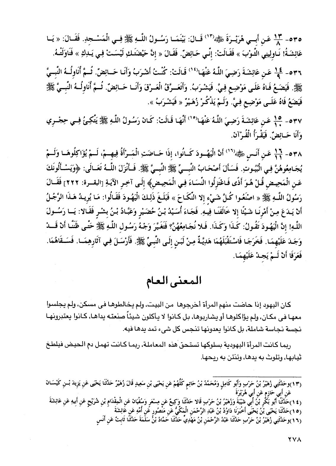 536 - عن عائشة رضي الله عنها قالت: كنت أشرب وأنا حائض. ثم أناوله النبي صلى الله عليه وسلم. فيضع فاه على موضع في. فيشرب. وأتعرق العرق وأنا حائض. ثم أناوله النبي صلى الله عليه وسلم فيضع فاه على موضع في. ولم يذكر زهير "فيشرب".