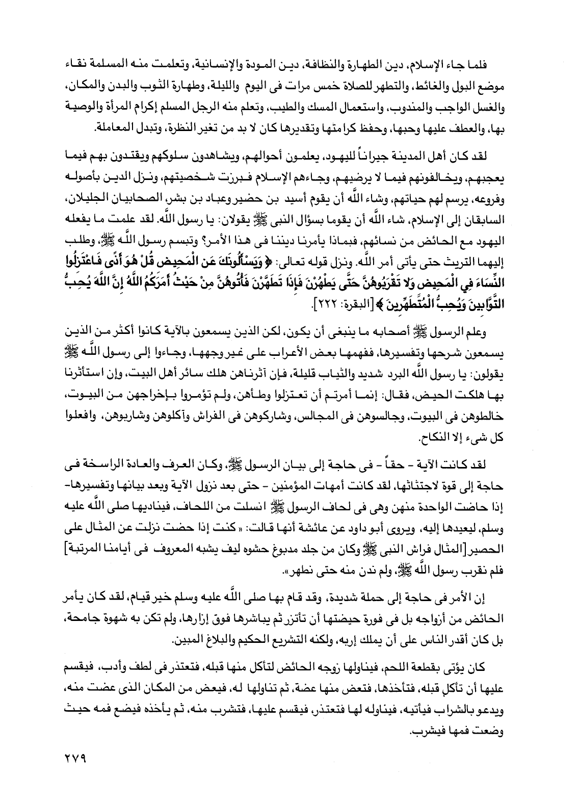 لقد كانت الآية -حقا- في حاجة إلى بيان الرسول صلى الله عليه وسلم، وكان العرف والعادة الراسخة في حاجة إلى قوة لاجتثاثها، لقد كانت أمهات المؤمنين -حتى بعد نزول الآية وبعد بيانها وتفسيرها- إذا حاضت الواحدة منهن وهي في لحاف الرسول صلى الله عليه وسلم انسلت من اللحاف، فيناديها صلى الله عليه وسلم، ليعيدها إليه، ويروي أبو داود عن عائشة أنها قالت: "كنت إذا حضت نزلت عن المثال على الحصير [المثال فراش النبي صلى الله عليه وسلم وكان من جلد مدبوغ حشوه ليف يشبه المعروف في أيامنا المرتبة] فلم نقرب رسول الله صلى الله عليه وسلم، ولم ندن منه حتى نطهر".