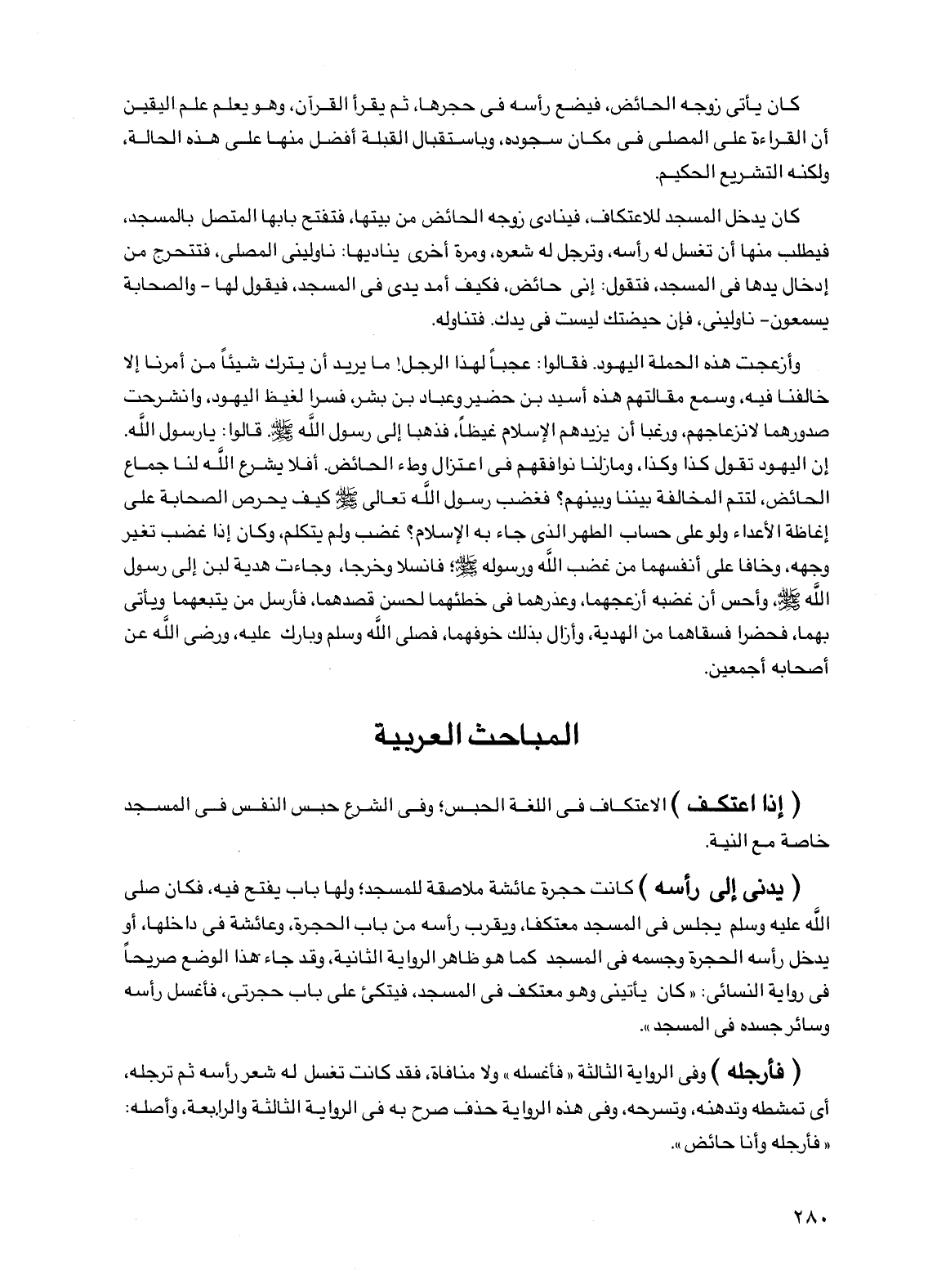 كان يدخل المسجد للاعتكاف، فينادي زوجه الحائض من بيتها، فتفتح بابها المتصل بالمسجد، فيطلب منها أن تغسل له رأسه، وترجل له شعره، ومرة أخرى يناديها: ناوليني المصلى، فتتحرج من إدخال يدها في المسجد، فتقول: إني حائض، فكيف أمد يدي في المسجد، فيقول لها -والصحابة يسمعون- ناوليني، فإن حيضتك ليست في يدك. فتناوله.