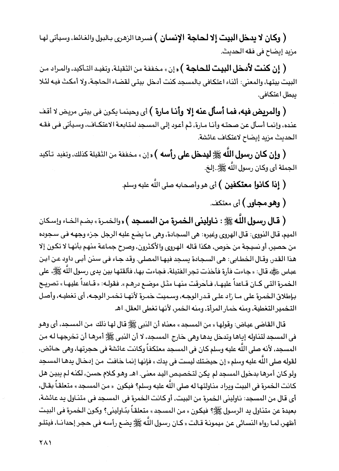 (قال رسول الله صلى الله عليه وسلم: ناوليني الخمرة من المسجد) "والخمرة" بضم الخاء وإسكان الميم، قال النووي: قال الهروي وغيره: هي السجادة، وهي ما يضع عليه الرجل جزء وجهه في سجوده من حصير، أو نسيجة من خوص، هكذا قاله الهروي والأكثرون، وصرح جماعة منهم بأنها لا تكون إلا هذا القدر. وقال الخطابي: هي السجادة يسجد فيها المصلي. وقد جاء في سنن أبي داود عن ابن عباس رضي الله عنه قال: "جاءت فأرة فأخذت تجر الفتيلة، فجاءت بها، فألقتها بين يدي رسول الله صلى الله عليه وسلم، على الخمرة التي كان قاعدا عليها، فأحرقت منها مثل موضع درهم". فقوله: "قاعدا عليها" تصريح بإطلاق الخمرة على ما زاد على قدر الوجه، وسميت خمرة لأنها تخمر الوجه، أي تغطيه، وأصل التخمير التغطية، ومنه خمار المرأة، ومنه الخمر، لأنها تغطي العقل. اهـ.