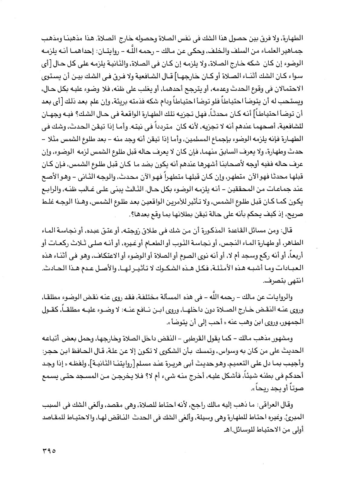 وقال العراقي: ما ذهب إليه مالك راجح، لأنه احتاط للصلاة، وهي مقصد، وألغى الشك في السبب المبرئ. وغيره احتاط للطهارة وهي وسيلة، وألغى الشك في الحدث الناقض لها، والاحتياط للمقاصد أولى من الاحتياط للوسائل. اهـ.