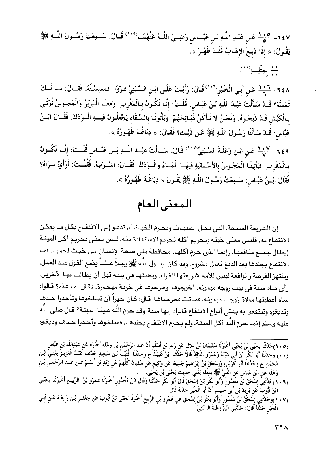 649 - عن ابن وعلة السبئي قال: سألت عبد الله بن عباس قلت: إنا نكون بالمغرب. فيأتينا المجوس بالأسقية فيها الماء والودك. فقال: اشرب. فقلت: أرأي تراه؟ فقال ابن عباس: سمعت رسول الله صلى الله عليه وسلم يقول "دباغه طهوره".