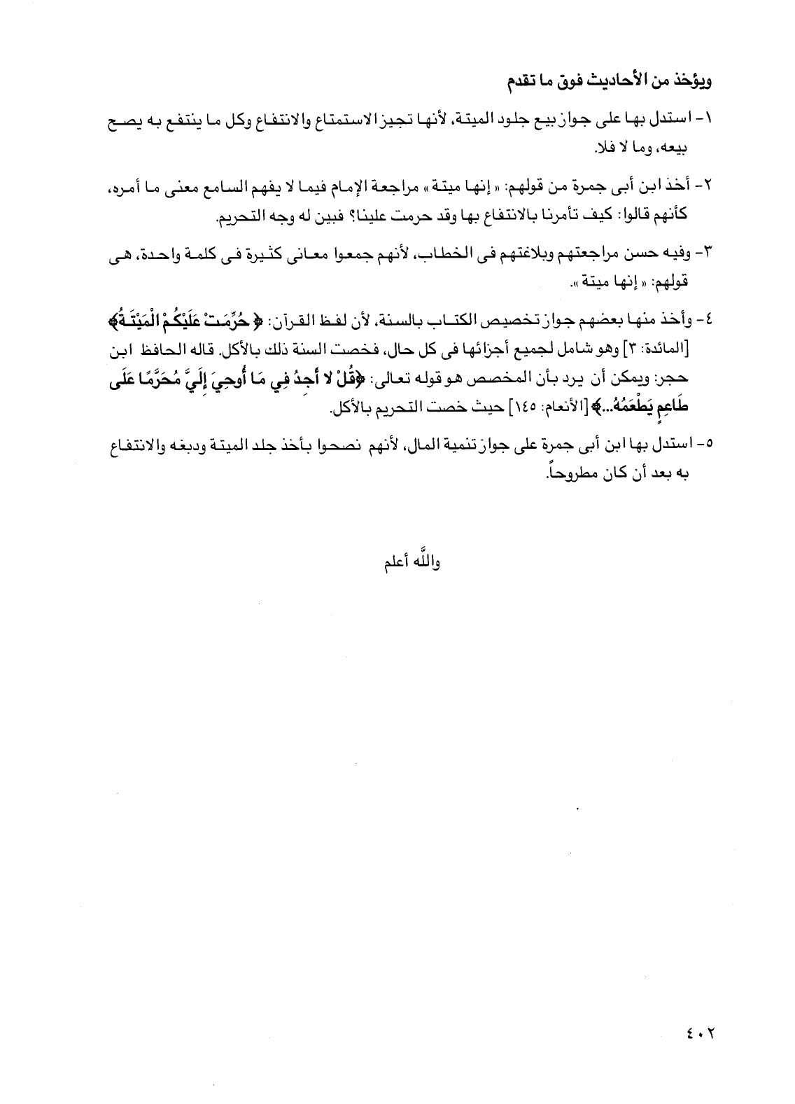 4 - وأخذ منها بعضهم جواز تخصيص الكتاب بالسنة، لأن لفظ القرآن: {حرمت عليكم الميتة} [المائدة: 3] وهو شامل لجميع أجزائها في كل حال، فخصت السنة ذلك بالأكل. قاله الحافظ ابن حجر: ويمكن أن يرد بأن المخصص هو قوله تعالى: {قل لا أجد في ما أوحي إلي محرما على طاعم يطعمه ... } [الأنعام: 145] حيث خصت التحريم بالأكل.