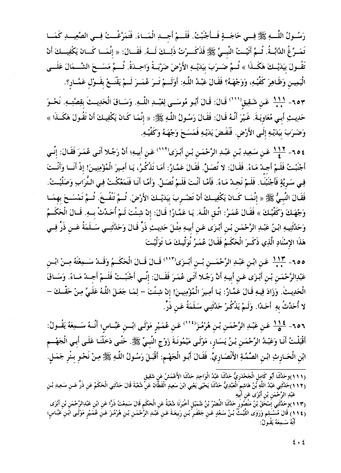654 - عن سعيد بن عبد الرحمن بن أبزى عن أبيه؛ أن رجلا أتى عمر فقال: إني أجنبت فلم أجد ماء. فقال: لا تصل. فقال عمار: أما تذكر، يا أمير المؤمنين! إذ أنا وأنت في سرية فأجنبنا. فلم نجد ماء. فأما أنت فلم تصل. وأما أنا فتمعكت في التراب وصليت. فقال النبي صلى الله عليه وسلم "إنما كان يكفيك أن تضرب بيديك الأرض. ثم تنفخ. ثم تمسح بهما وجهك وكفيك" فقال عمر: اتق الله. يا عمار! قال: إن شئت لم أحدث به. قال الحكم وحدثنيه ابن عبد الرحمن بن أبزى عن أبيه مثل حديث ذر قال وحدثني سلمة عن ذر في هذا الإسناد الذي ذكر الحكم فقال عمر نوليك ما توليت.