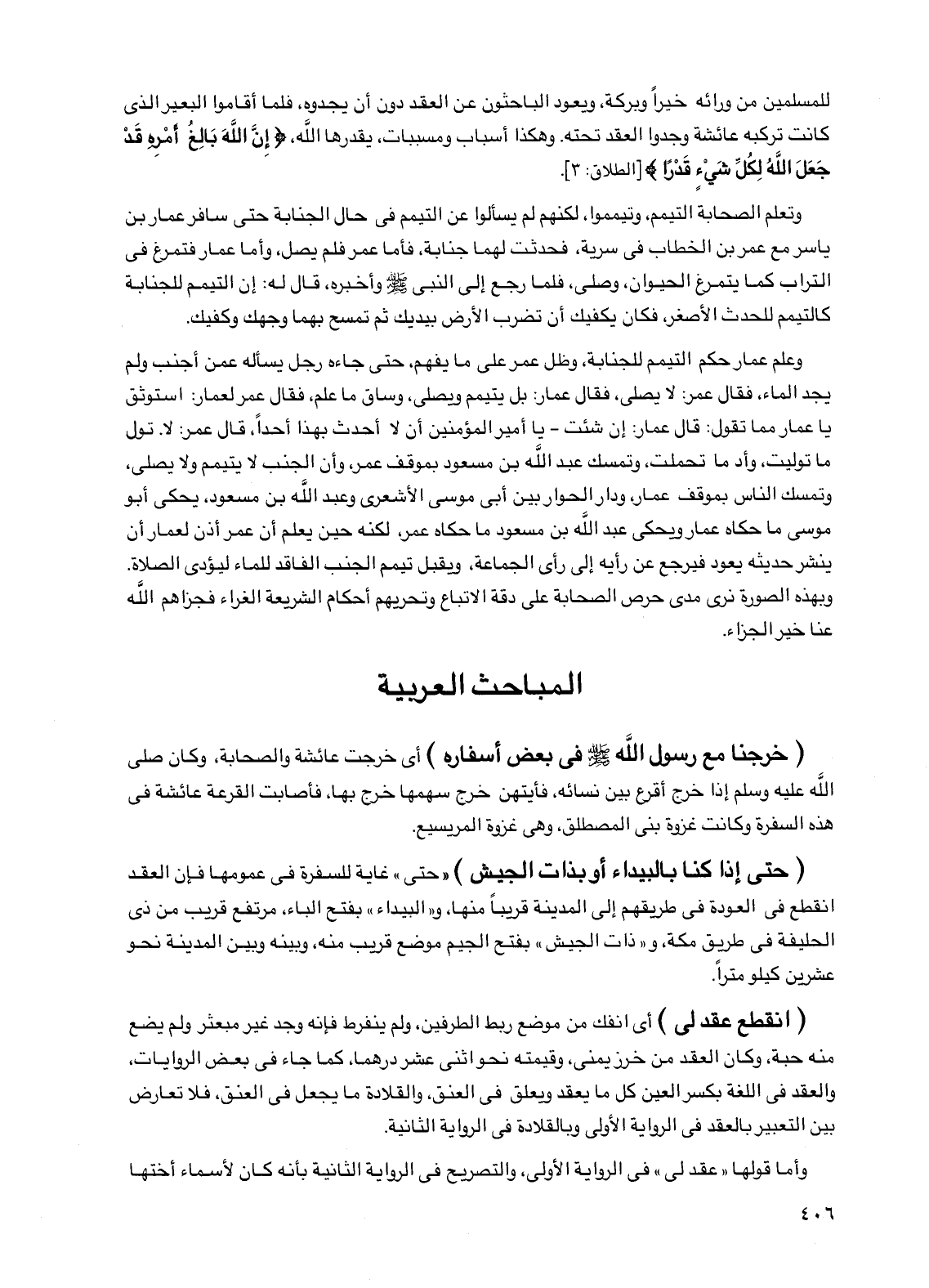 (حتى إذا كنا بالبيداء أو بذات الجيش) "حتى" غاية للسفرة في عمومها فإن العقد انقطع في العودة في طريقهم إلى المدينة قريبا منها، و"البيداء" بفتح الباء، مرتفع قريب من ذي الحليفة في طريق مكة، و"ذات الجيش" بفتح الجيم موضع قريب منه، وبينه وبين المدينة نحو عشرين كيلو مترا.
