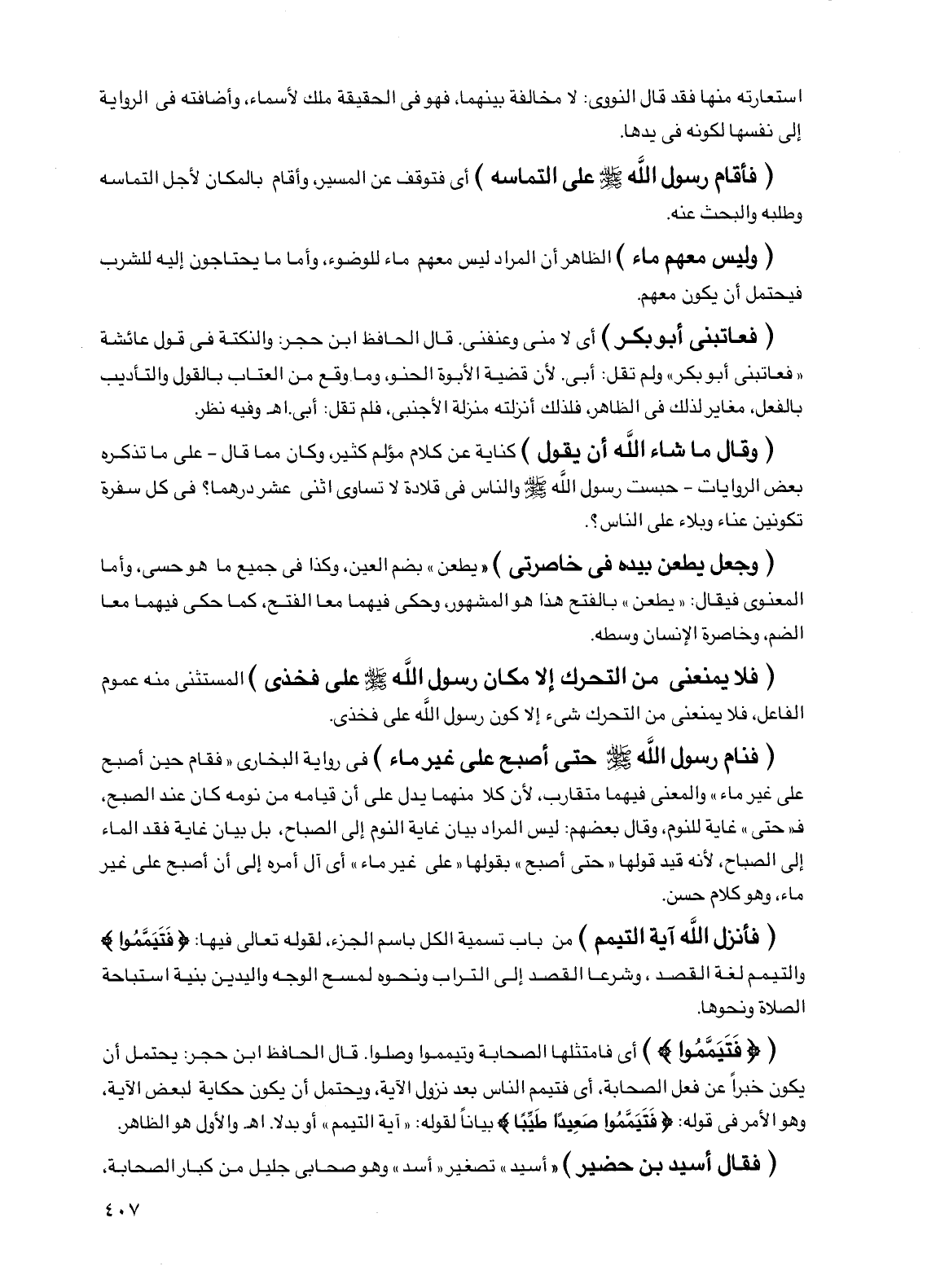(فنام رسول الله صلى الله عليه وسلم حتى أصبح على غير ماء) في رواية البخاري "فقام حين أصبح على غير ماء" والمعنى فيهما متقارب، لأن كلا منهما يدل على أن قيامه من نومه كان عند الصبح، فـ"حتى" غاية للنوم، وقال بعضهم: ليس المراد بيان غاية النوم إلى الصباح، بل بيان غاية فقد الماء إلى الصباح، لأنه قيد قولها "حتى أصبح" بقولها "على غير ماء" أي آل أمره إلى أن أصبح على غير ماء، وهو كلام حسن.